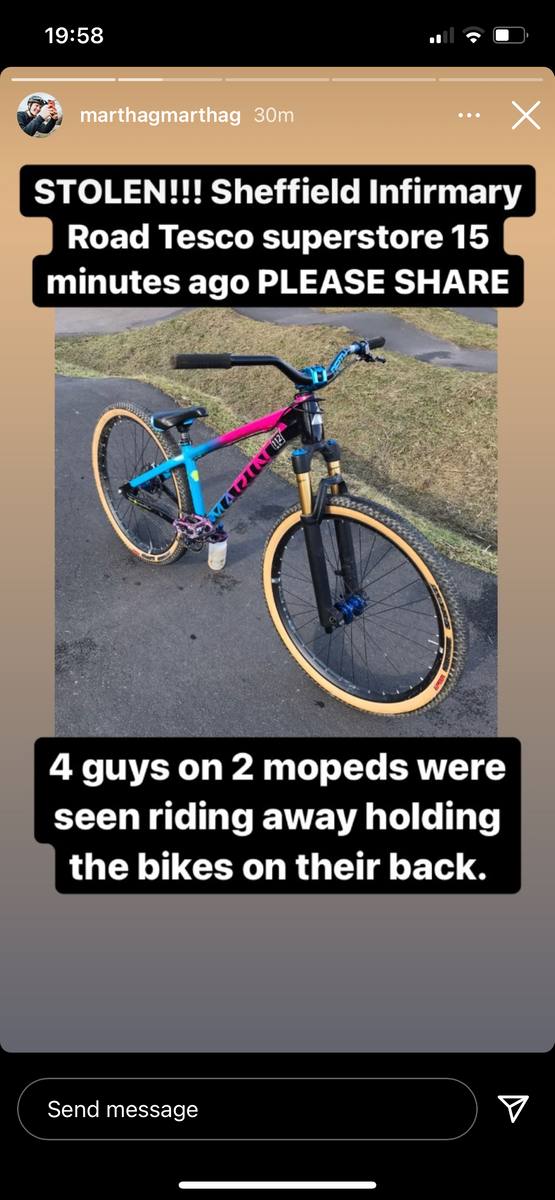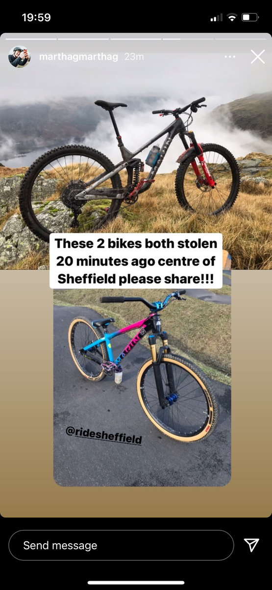 Gowaan Gal Martha Gill has just posted on Instagram that she’s had two bikes stolen from her van in Sheffield tonight. Thieves, reported to be on mopeds, have taken her Marin Alcatraz dirt jump bike plus her Marin Alpine Trail Carbon. The theft looks to have taken place around 7pm on 23rd February.