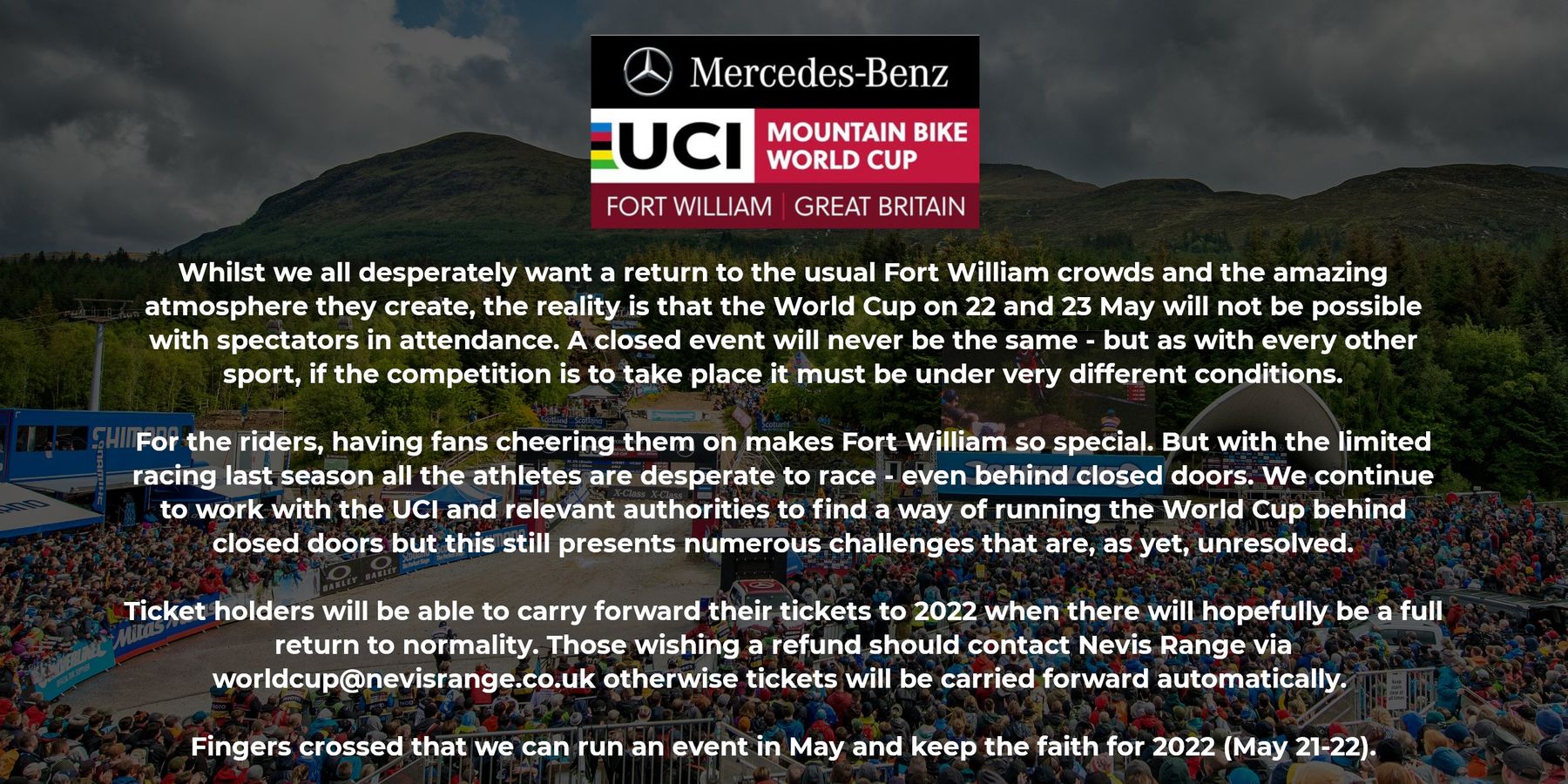 UCI Mountain Bike World Cup organisers today confirmed that if the event takes place at Nevis Range, Fort William on the scheduled dates of 22-23 May, it will be without spectators.