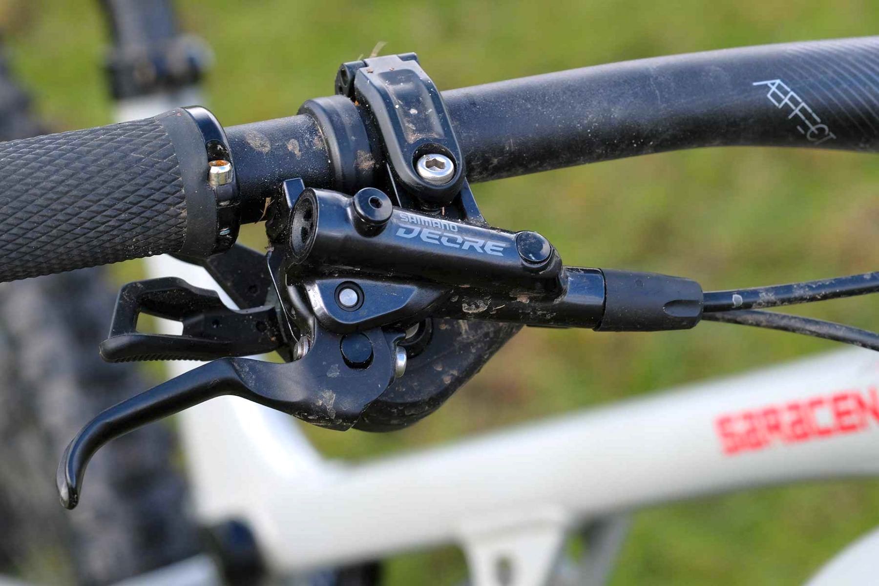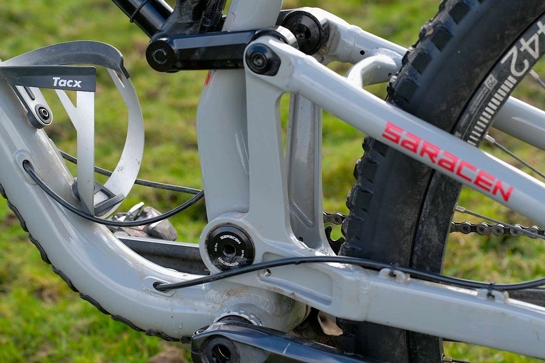 Looking around the frame, it’s neatly welded, with mostly concealed cables and a mid-grey finish that I’ve not managed to harm, despite wearing the paint off the Deore cranks. The main pivot runs on sealed bearings, as do the linkages. It seems that Saracen has learned its lessons from previous bushing tolerance issues in previous models. Other improvements over previous Ariels are things like room for a bottle cage and a very dropped top tube for maximum standover. Riders who up-size a frame will probably wonder why the seatmast is so big as it prevents riders running even longer droppers than the 150mm post supplied. And one other frame niggle – the dropout is held on with a slim, alloy nut that is threadlocked in place. Fine unless it comes loose and then no one in your group is likely to carry an adjustable spanner, but enough disaster projection!