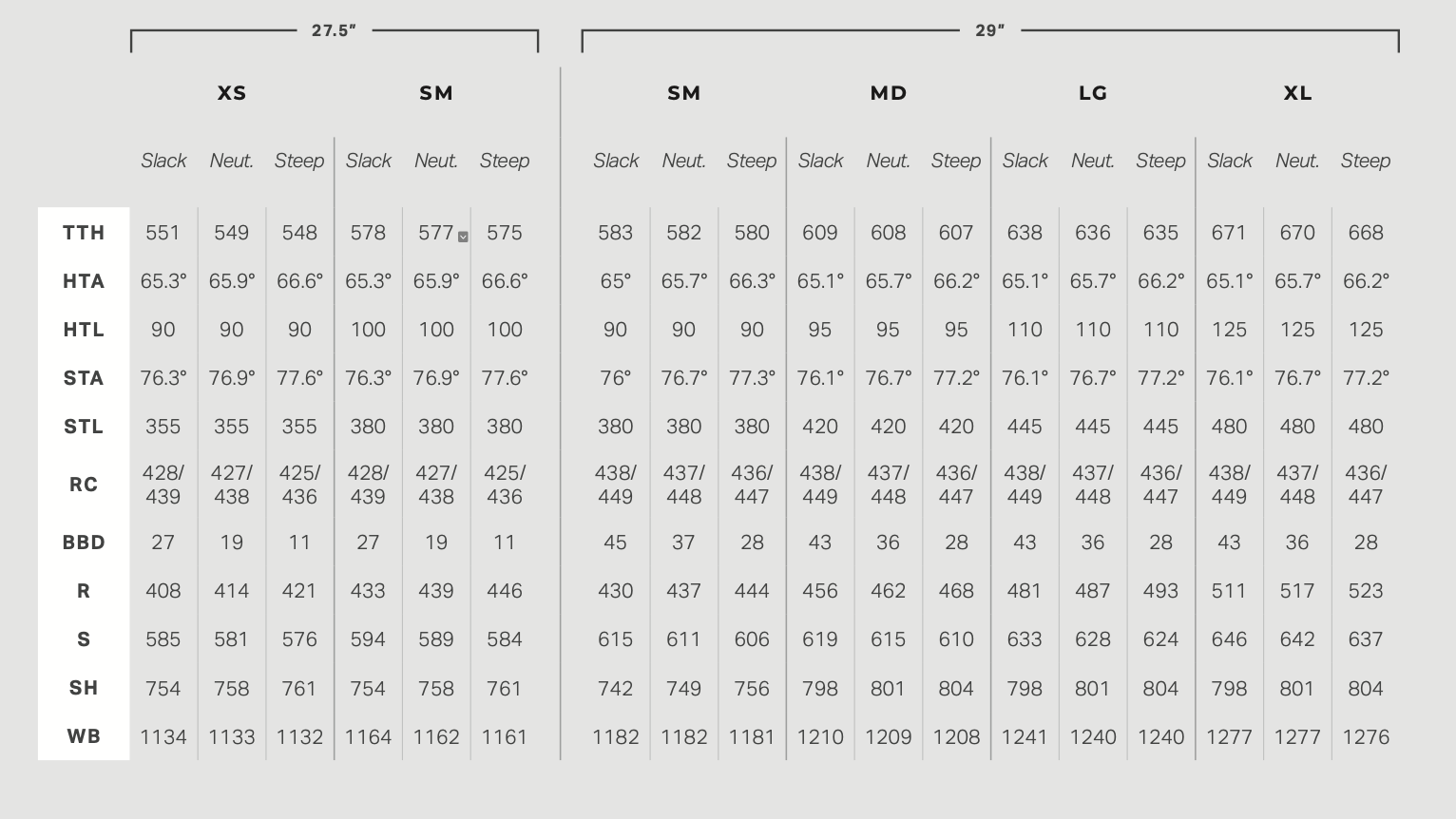 Our size extra-small and small frames have a visibly different frame silhouette than our medium through extra-large frames. The two smallest sizes use a 190x45mm shock to achieve 140mm of travel which creates a lightweight kinematic, making it easier for small riders to properly set up their suspension and use all of the travel. The medium through extra-large frames use a 210×52.5mm shock to achieve 140mm of travel, so no matter what size of rider you are our bikes are designed to perform at their best.