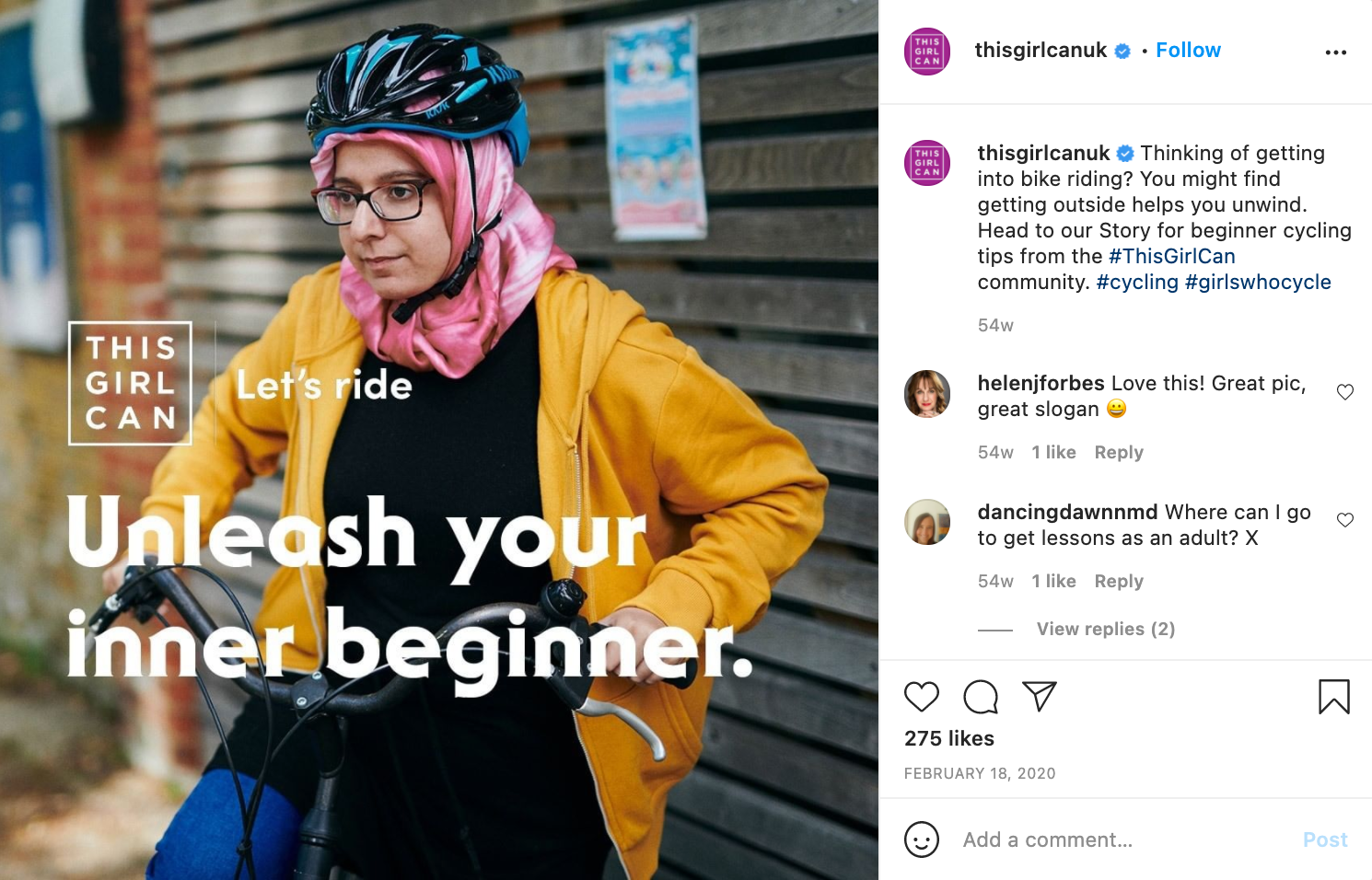 This Girl Can is about being encouraging whatever exercise you like and whatever shape you are. From body building to swimming, with people who have disabilities and those who don’t, all ages, ethnicities and backgrounds. It is a positive and encouraging place to be and it reminds you “This girl can!”.