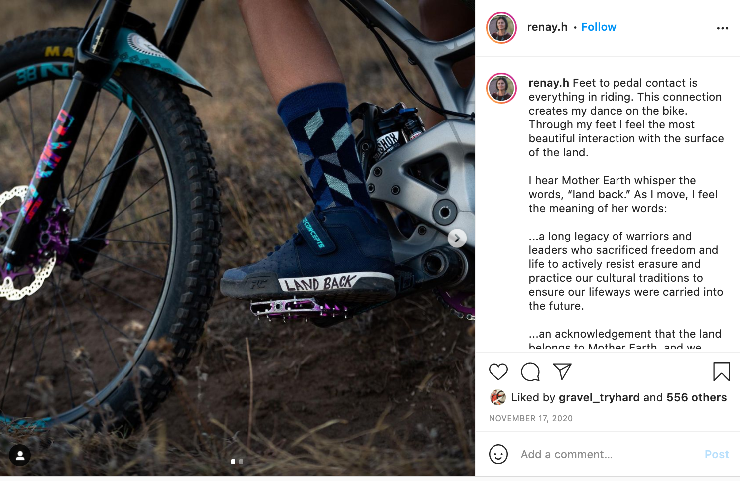 I love how Renee speaks of connection to the land, of stewarding the land rather than managing it, and how the experience of mountain biking is a holistic experience of soil, terrain, air, history, plants, animals, water, people. She writes powerfully about the land, our destruction of it, and the issue of stolen lands. This inspires me to think about our own UK land ownership structures and access rights, and also makes me hope to learn how to be a better and more respectful visitor to the USA.