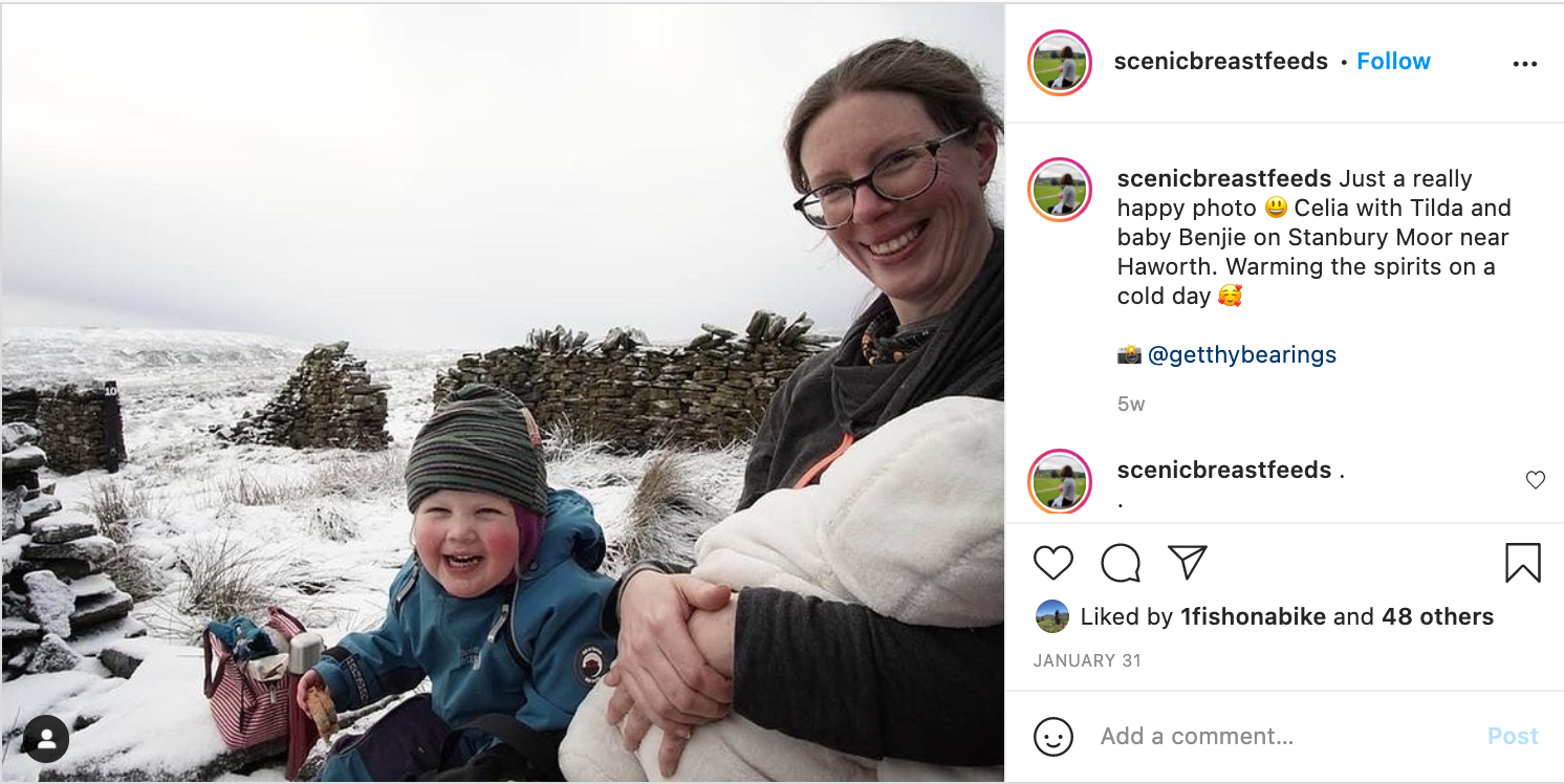 Breastfeeding is both wonderful and exhausting. It continues the experience of pregnancy, where your body is not your own and performs in ways that can be incredible or undesirable. Having a small human physically dependent on you for food, at whatever time of day or night, can feel like a constraining and draining experience. This Instagram feed reminds me of the better side of it – the instant portability, the closeness with your child, and the freedom from sterilisers and bottles that it can offer. My children are way past this stage now, but it’s nice to be reminded that I helped make them the people they are today and that I’m still needed – even if they can cook their own tea these days.