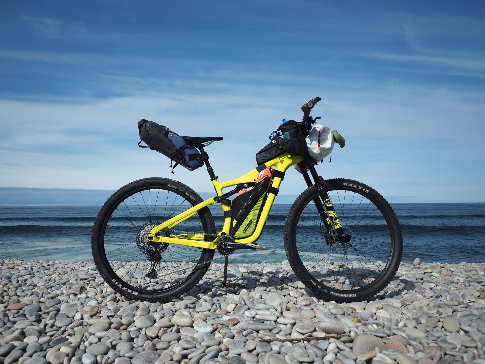 Bike: It’s a Brother Cycles Big Bro. 29×2.35 rear, 2.6 front, Hope hubs, single speed 32×21, faux-Jones handlebars, XT brakes, Brand X dropper. Homemade frame bag from another bike that mostly fits the frame – has since been slightly modified, homemade seat, snack, and bottle bags. A well-aged Revelate gas tank bag and a Straight Cut handlebar harness thing holds a drybag with sleeping kit etc.
