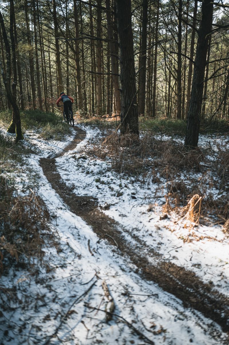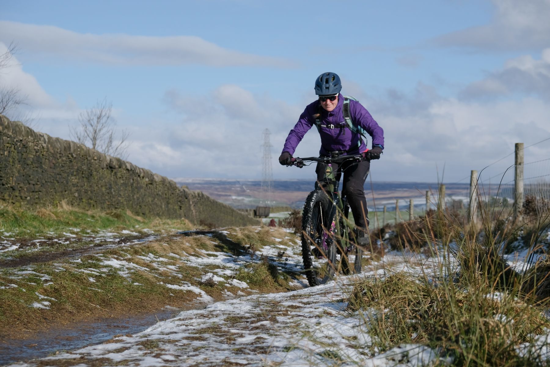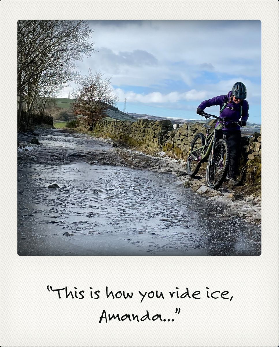We set off with a fizz of excitement about the clear blue skies we were gifted. It was cold – so cold that the icicles had icicles, so we planned to keep moving without losing sight of the goal. Now, I’ll be honest, I’d forgotten about the bingo card almost immediately we started as I had bigger things to worry about… ice. We’d barely introduced ourselves when I demonstrated to Julia what type of a rider I am. Presented with a wide tarmac road covered in sheet ice, I announced ‘it’ll go’ and rolled hesitantly towards the deathtrap. It didn’t ‘go’, and I got to the other side of it on my arse. Given that we’d only just met, Julia didn’t take a photo of my misjudgement so we had that all-important conversation of ‘Yeah, if I’m still breathing get a photo before you help me up!’ before we continued on our quest for grip.