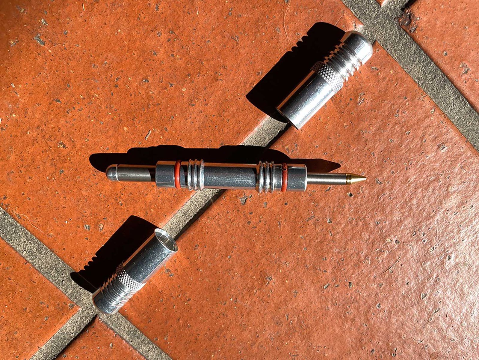 The Dynaplug Racer Plus, meanwhile is the size of an IKEA pencil and designed to be a quick and easy fix for racers and people after a more compact version. The alloy handle has two sealed caps, each with a Dynaplug ready for action (in this case a regular and a large one). Cunningly, both plug holders are double ended and unscrew to reveal two more plugs, so if you need to double-plug a snakebite, you’re still covered.