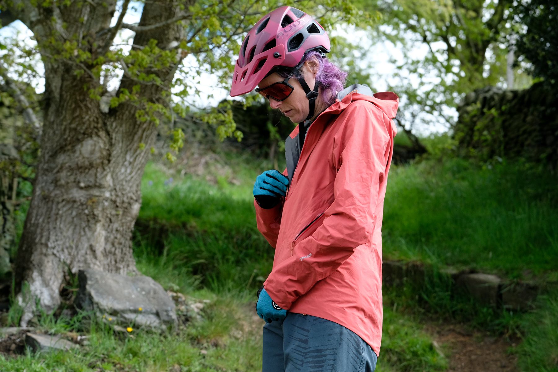 All the finishes – the seams, the stitching, the taping – are absolutely flawless and you couldn’t ask for a higher quality finish. There isn’t a lot by way of reflective bits on it, but off-road I’m not too fussed about that. Being a mucky pup, I’ve had cause to wash it on a number of occasions and it’s not suffered for the experience. I’ve been testing the women’s fit jacket, but there’s a men’s cut too – and both men’s and women’s come in the same colour choices – this reddish colour, and a nice grey-blue too.