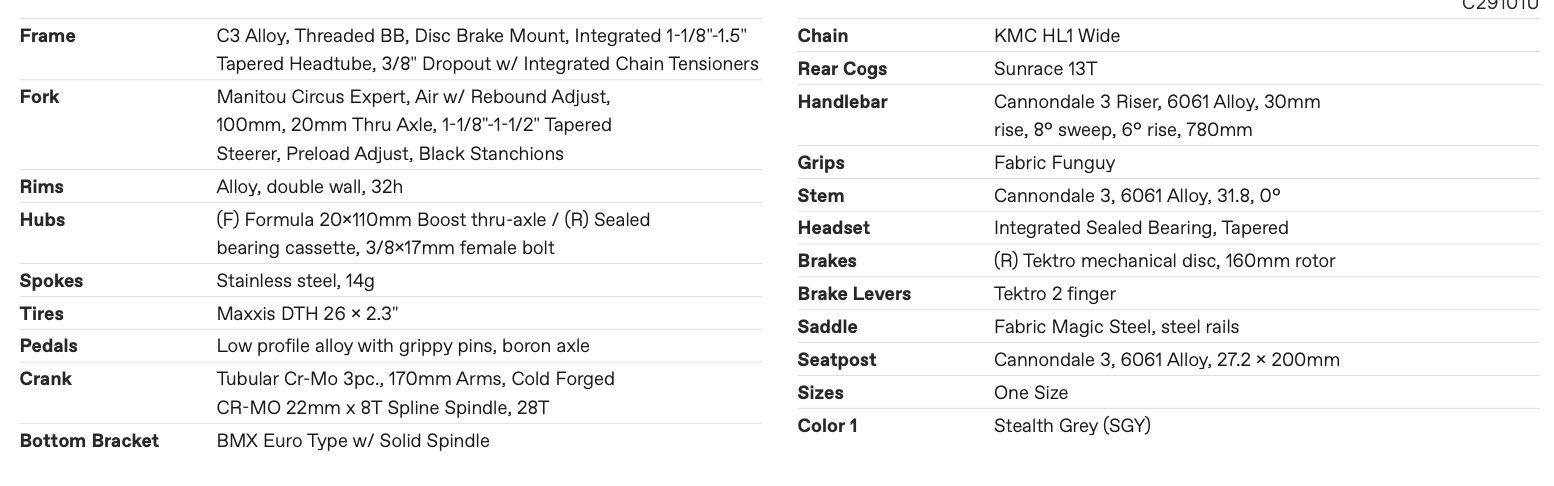 - Style for days. Ready to roll, straight out the box. 26” wheels, Fabric Magic saddle, Funguy grips, Manitou jump fork, extra-long brake hosing for barspins, even griptape graphics (shovel not included).
