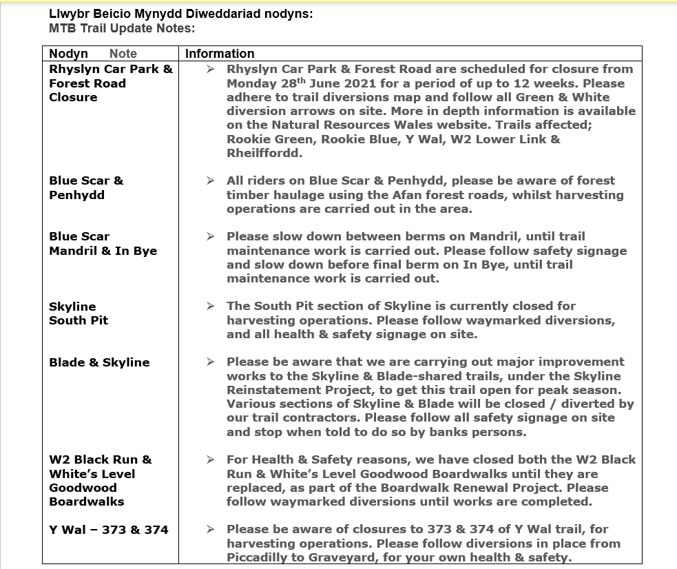 Skyline: The ‘South Pit’ section is closed due to harvesting operations and a diversion is in place. Other diversions in place on ‘Short & Sweet’, ‘Riding High’, ‘On the Edge’ and ‘Coed Mog 1’ sections due imminent trail maintenance works.