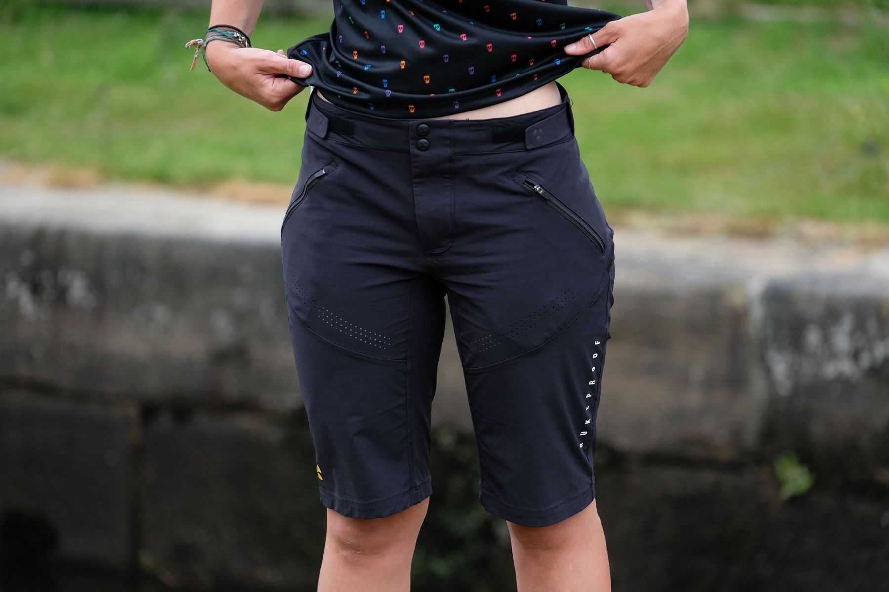 The biggest update to the Nukeproof Blackline shorts is a high quality liner… which is not pictured since a paddleboarder came up the canal whilst we were taking photos. The inner waist has adjustable Velcro tabs, there’s a zip and two poppers for a secure fit, and plenty of laser cut breathable holes.
