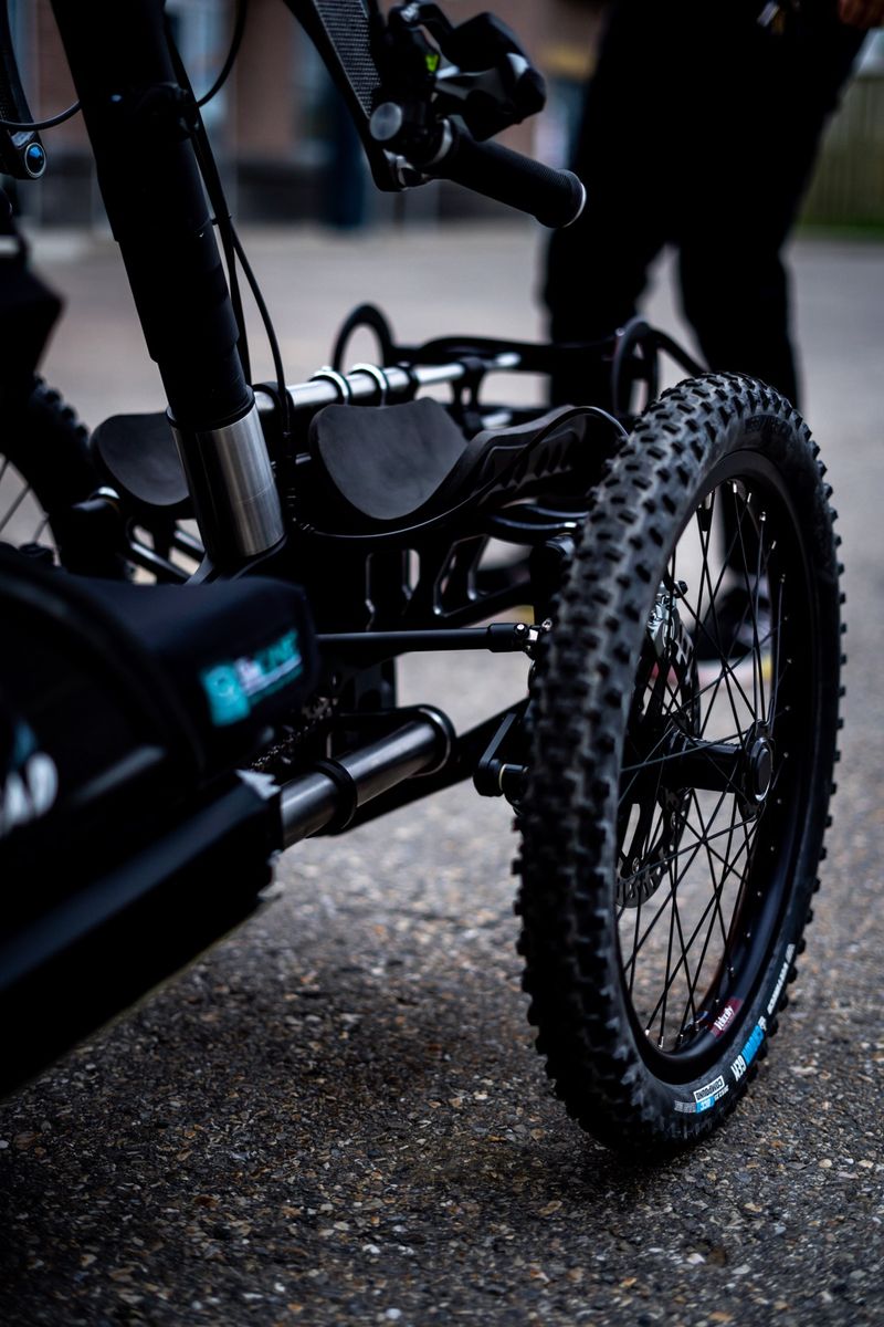 At a recent seminar on trail building for hand cycles, we heard how some trikes require a greater width, and how they can struggle to access paths where the surface is off camber or falls away, or has tight corners. Imagine towing a child trailer around your local trails and think of all the places it would get stuck, or all the motorbike-stopping barriers that you’d have to squeeze round and under, and you can begin to see the difficulties a hand cyclist can face. As with the Reach, the width of the RX is akin to most mountain bike handlebars, so singletrack is more easily accessible. The two front wheels use the same articulated set up as the Reach to enable access over technical trails, without the trike tipping. You can see in this video just how capable it is.