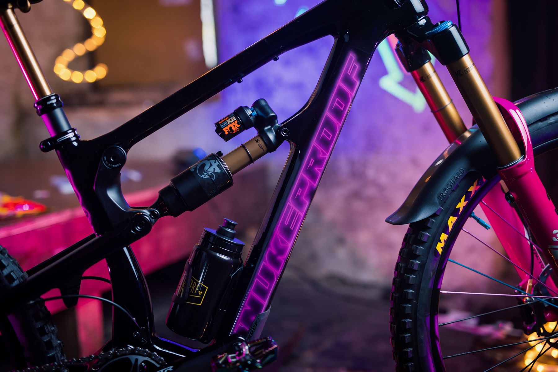 The inspiration for the design and consequently the shoot came about from my wild uni party days, we used to have hidden cave raves in nearby slate quarries, and I wanted a bike design that represented that part of my life. Think sticky floors, glow sticks and killer beats. I wanted a something bold and pink (of course) with a retro neon theme. I dropped the idea on Jonny at EliteRefinish, and he brought my vision to life