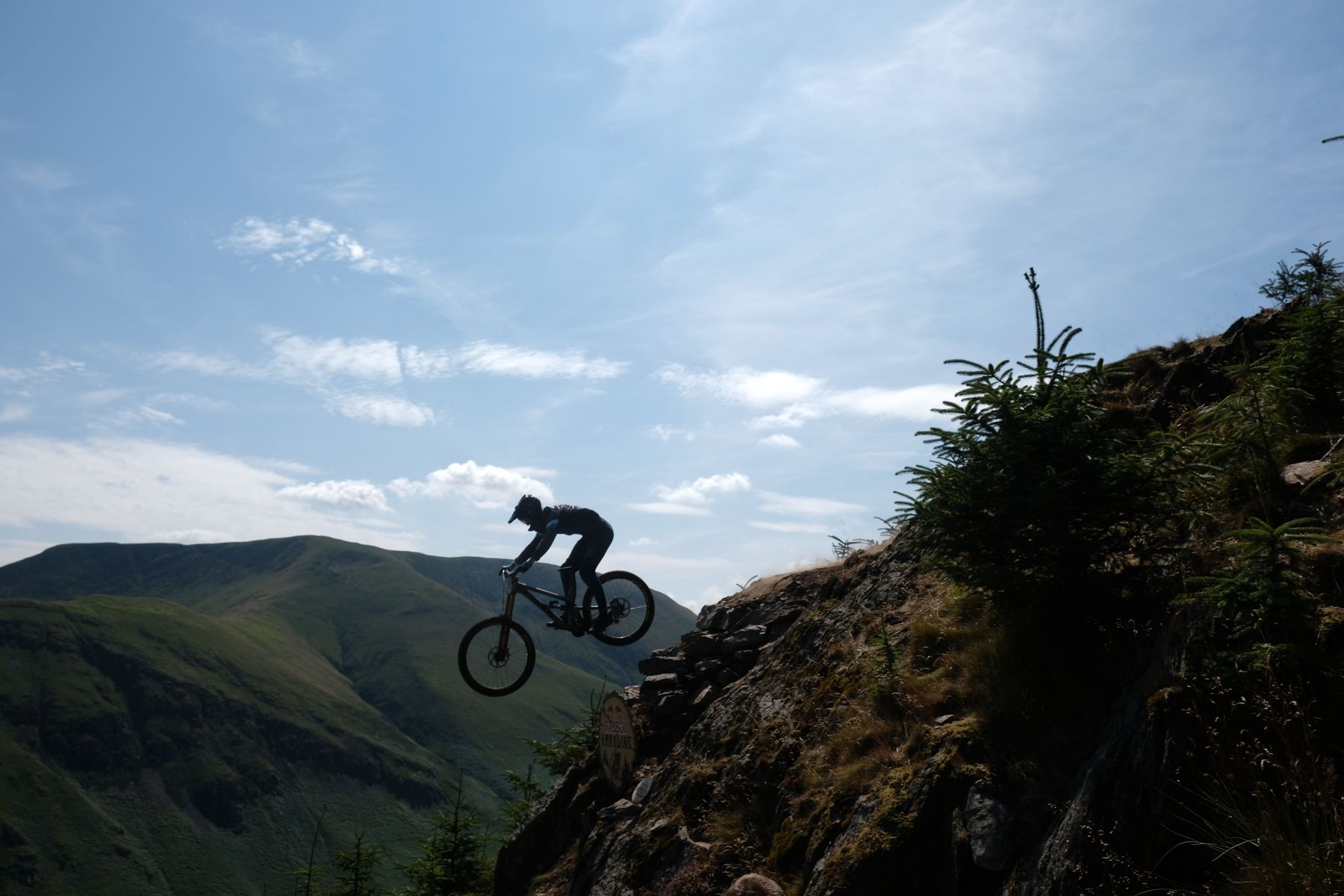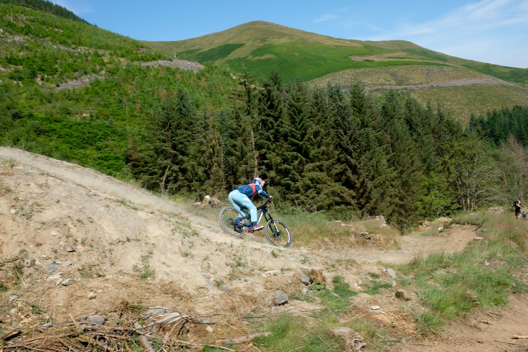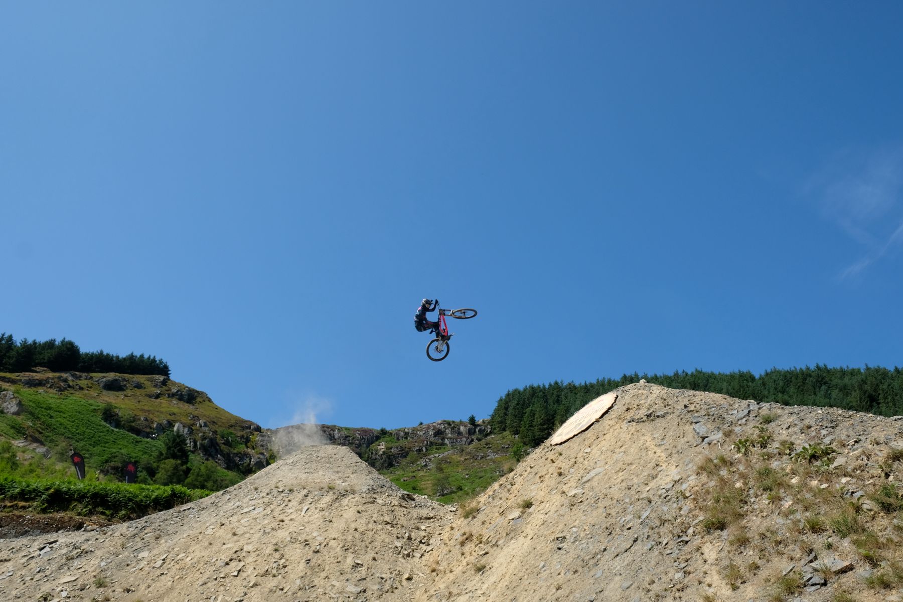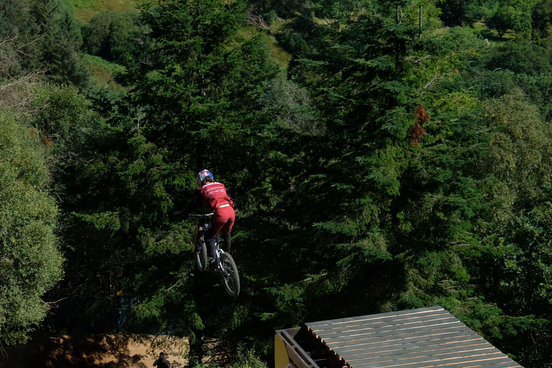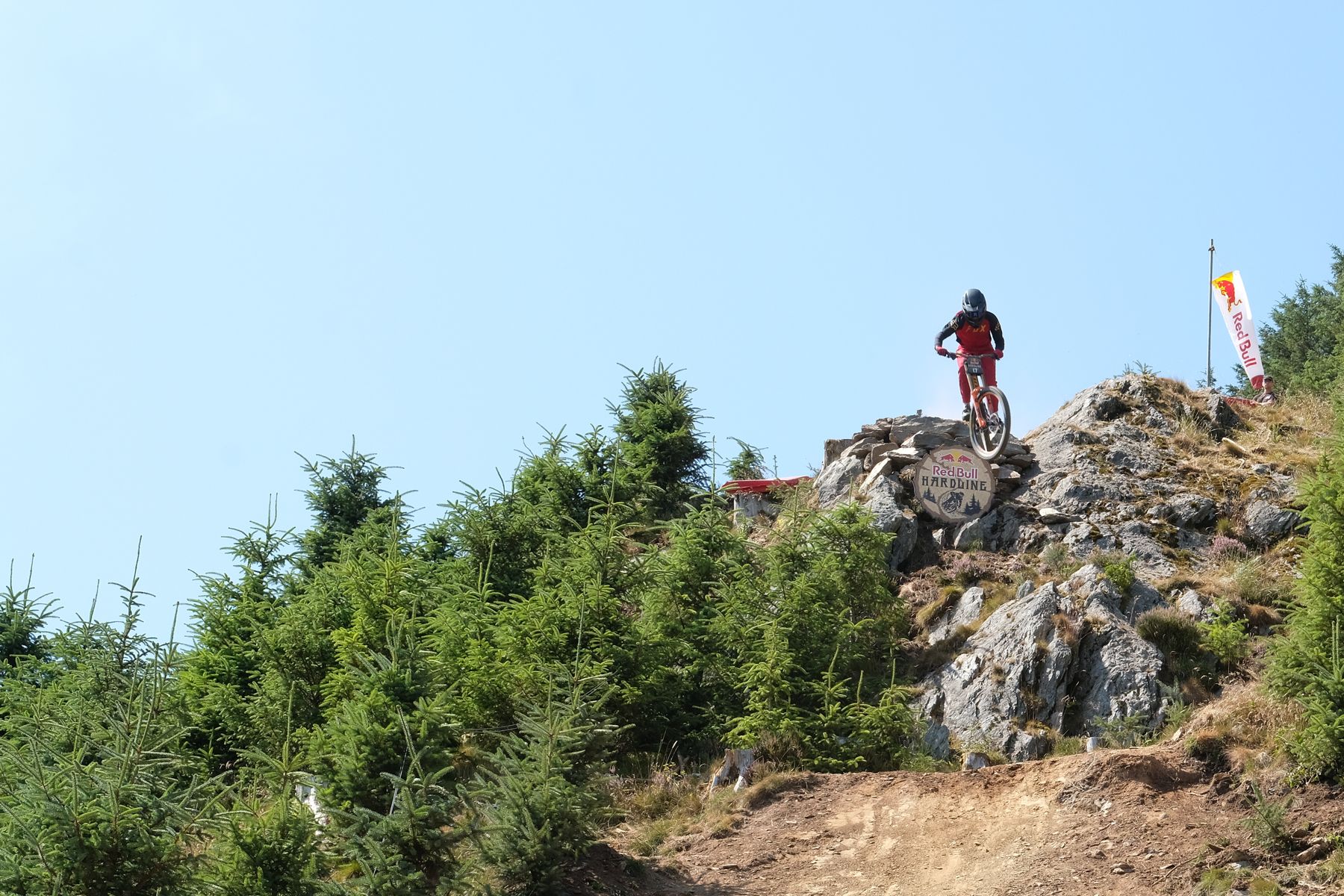 Unlike Red Bull Rampage, Hardline is a timed event which has riders not just trying to get down, but racing to get there. How seriously some of the riders were taking the timed element varied somewhat, with many of those from a Freeride background taking a more casual – if stylish – approach. Those with a DH race background were apparent, squashing the jumps, staying low, and squeezing all the speed they could out of the faster sections. Sometimes riding the ragged edge tipped over into over the bars, off the edge of a boulder, or into a crash mat (phew).