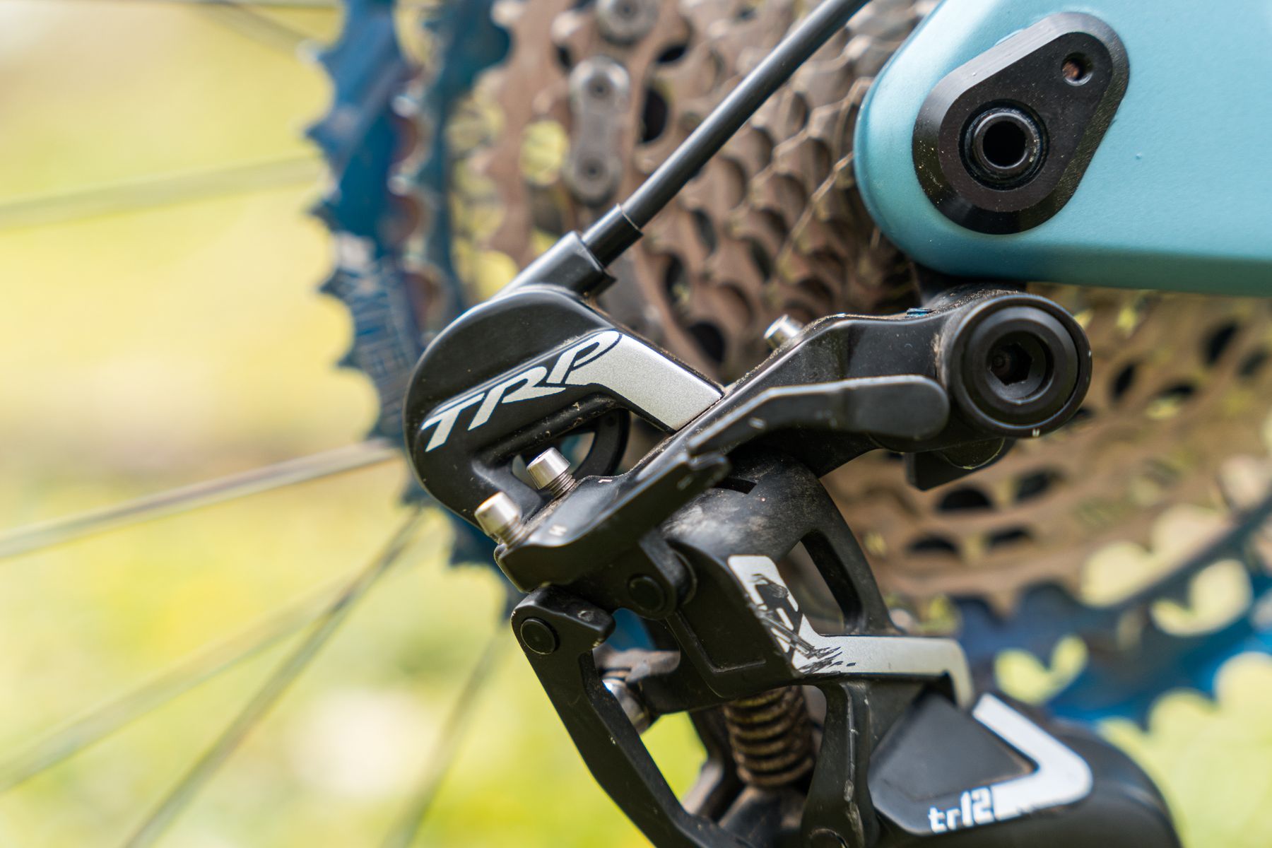 One of the stand out features of both the DH7 and this TR12 is the unique (to TRP), Hall Lock lever. Born out of a desire to make a really quiet drivetrain, it’s designed to stop the mech from rotating around the bolt that fastens it to the frame. There’s a handy lever to release tension and let you remove the wheel from the frame, and while engaged it does a great job of keeping things quiet.