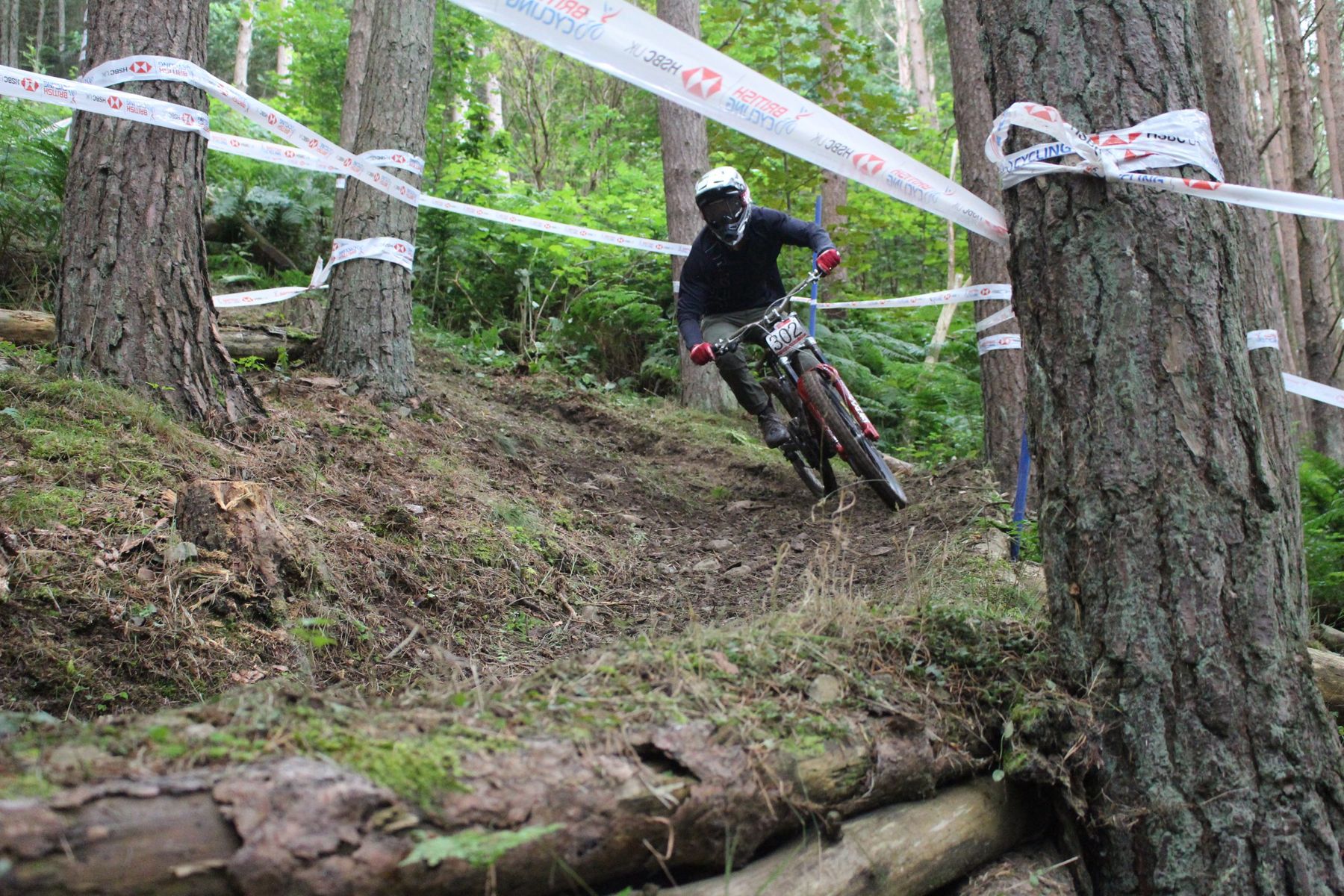 A few runs into seeding, the turn after that log drop was causing problems. Something seemed to be catching riders, and the logs holding the berm up had been smashed away by crashes.