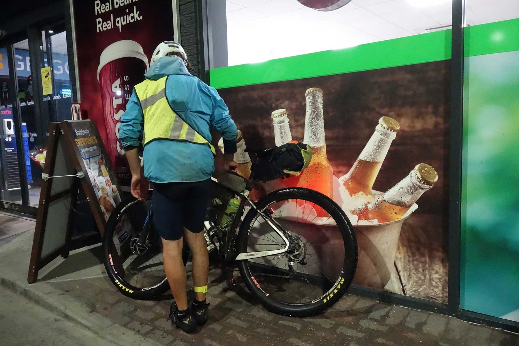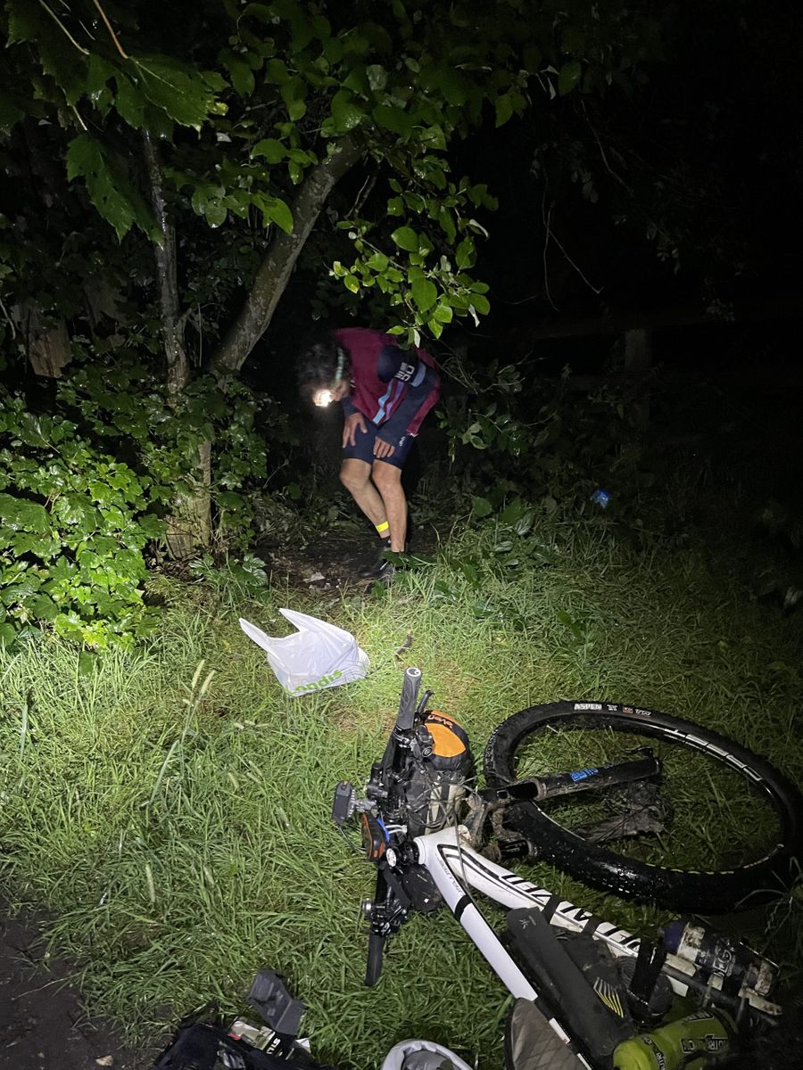 It seemed only fair to try to catch the second place rider, Donnacha Cassidy, who came through town 12 hours later. By then the conditions had changed and the sunny skies had turned to slick, wet rain. Donnacha appeared about 11pm and apparently hadn’t seen anyone since leaving Hayfield. It seems that every rider has found this section super hard and he was no different. While not as cheery as Chris, he was still pressing on and had a plan that involved the shortest possible detour to the all-night garage in town before finding the car park by the local fishing pond, flattening a few nettles and turning in for a few hours. He was gone again at first light.