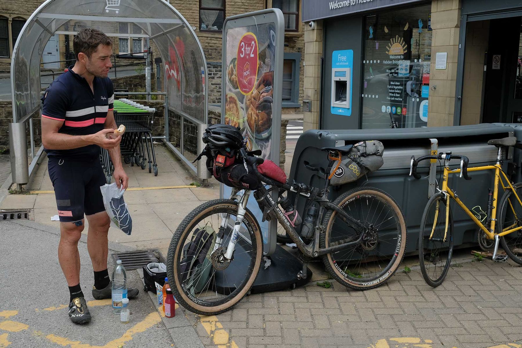 After we got down to the canal, Chris made a(n allowable) detour into Hebden Bridge, where he emerged with three different sorts of juice, an Irn Bru (he’s Scottish, he reckoned that finding Irn Bru in shops was a sign he was getting further north), some sort of all-day breakfast sandwich and the last jam doughnut in the shop. Oh, and an ice cream. He was immediately accosted by a spritely 73-year-old local boy who wanted to know all about his route and his bike, which Chris cheerily regaled him with before making his excuses to ride back up the canal and rejoin the route.