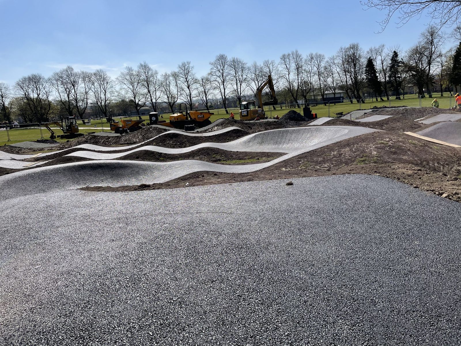 When some local parks were later due to be upgraded, pump tracks were a natural candidate for inclusion. They’re more versatile than skateparks or bike trails – skateparks have steeper sides and tighter angles, making them harder for less skilled riders or younger children to use, while bike trails can’t generally be used by scooters or skateboards and will usually be too easy for some riders or too tricky for others. A well designed pump track with tarmac surface can cater for all these different user groups, and can provide both easy riding for beginners and technical opportunity for experts. Plus, the tarmac finish costs a bit more at the outset, but doesn’t require as much ongoing maintenance. Becky was able to combine three pumptracks into one tender with a value of £180k. This saw Velosolutions deliver a small track at Craigspark in Livingston, a medium sized one in Bridgend, and a larger one in Fraser Park, Pumpherston.