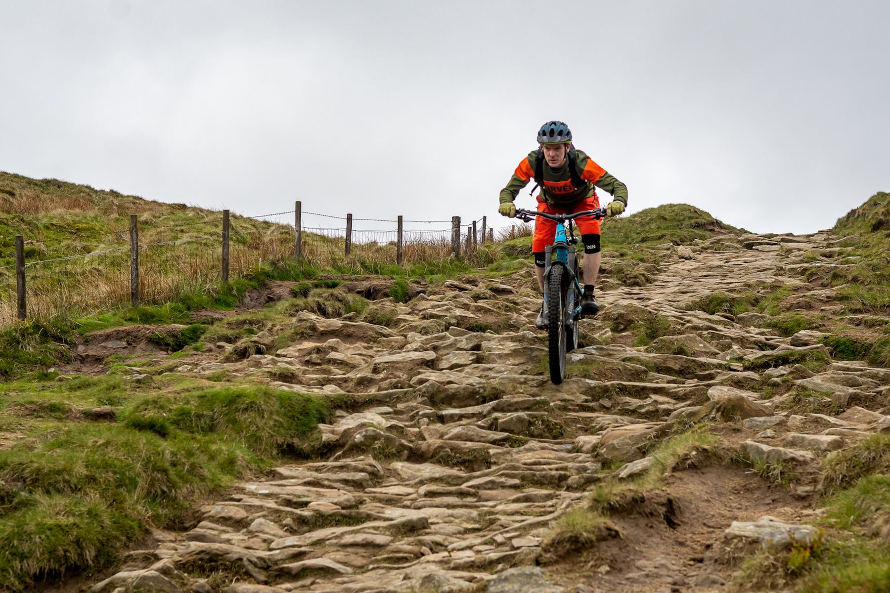 Derbyshire County Council, it’s fair to say, has form when it comes to – uh – creatively interpreting guidelines for the maintenance of some Peak District trails. This ancient thoroughfare is a case in point. It’s long been an entertainingly tricky thing to ride as a climb as well as a descent. Twenty years ago, scrabbly, rocky doubletrack gave frequent way to limestone bedrock slabs, requiring frequent thrutchy step-ups and no small amount of luck to clean. As a descent, then, any speed over the slabs would quickly give way to thin air, which could be entertaining if not anticipated. It was a lot of fun. While it’s certainly true that improvements needed to be made to enable easier access to folk who aren’t on mountain bikes, I’m not totally sure that concreting in a load of stone slabs, to make a sort of crazy-paved patio, is the best way to achieve this. It’s not without entertainment, but it does somewhat feel like a small corner of the Peak District is doing its best to emulate a garden centre.