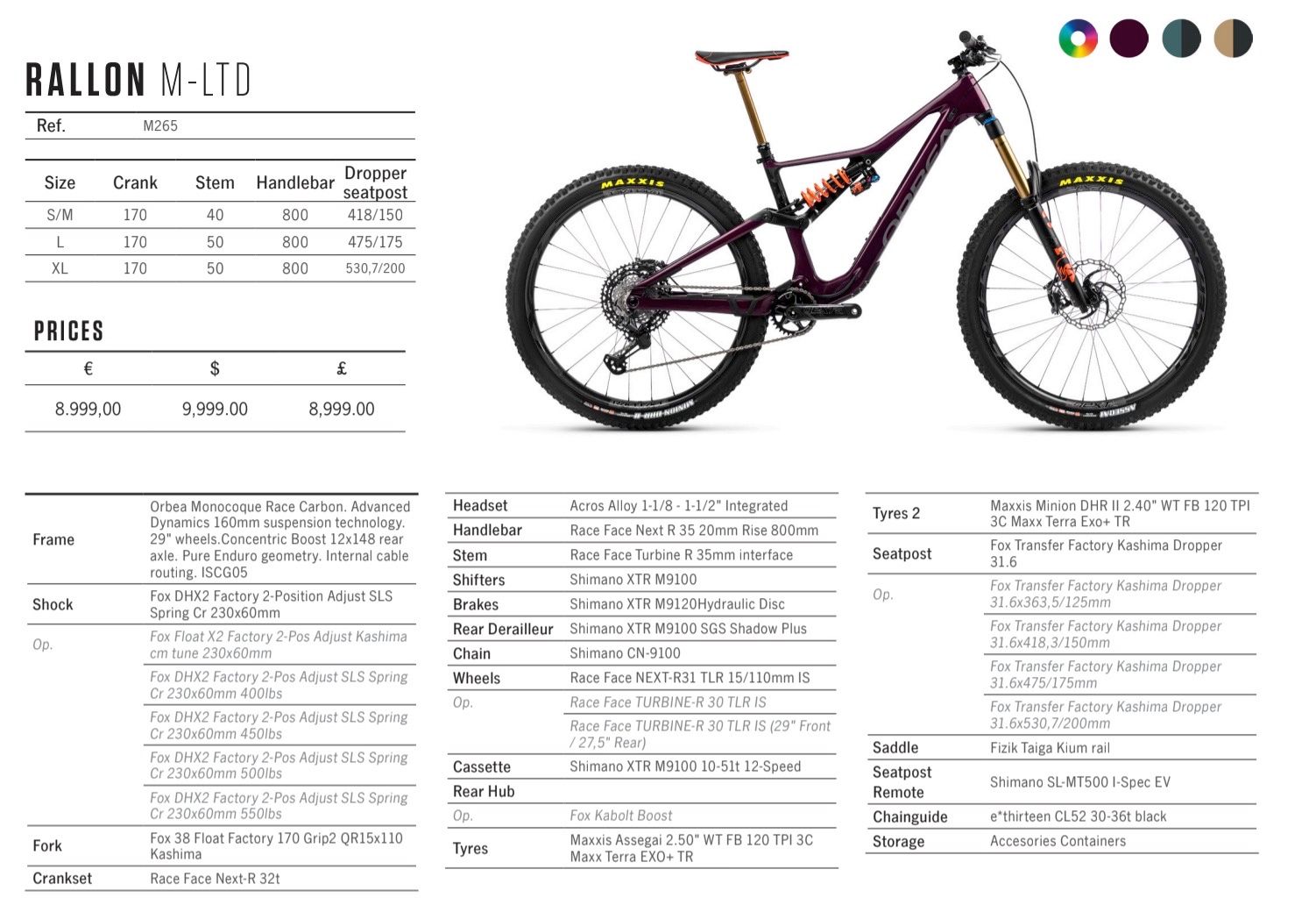 There are 4 Rallon builds with prices ranging from £4299 to £8999 but on top of the off the shelf options, there is also Orbea’s MYO customisation service which has a reported 1 million combination options. These customisations include changes to the components, frame colours, details etc.