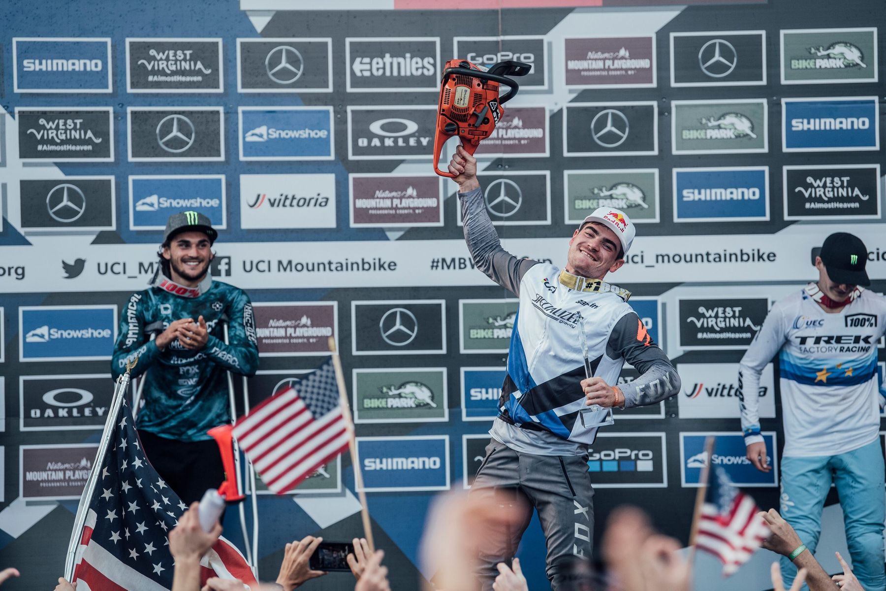 The track in Snowshoe is reasonably flat with huge rock gardens so carrying speed is everything. The week started badly for Daprela, crashing in the seeding run for Round 5. Things didn’t get any better in his race run when his front wheel exploded in one of those rock gardens. Nil points. Reece Wilson did him a huge favour though by taking his first World Cup win and holding off Bruni in second, and more importantly Vergier in third.