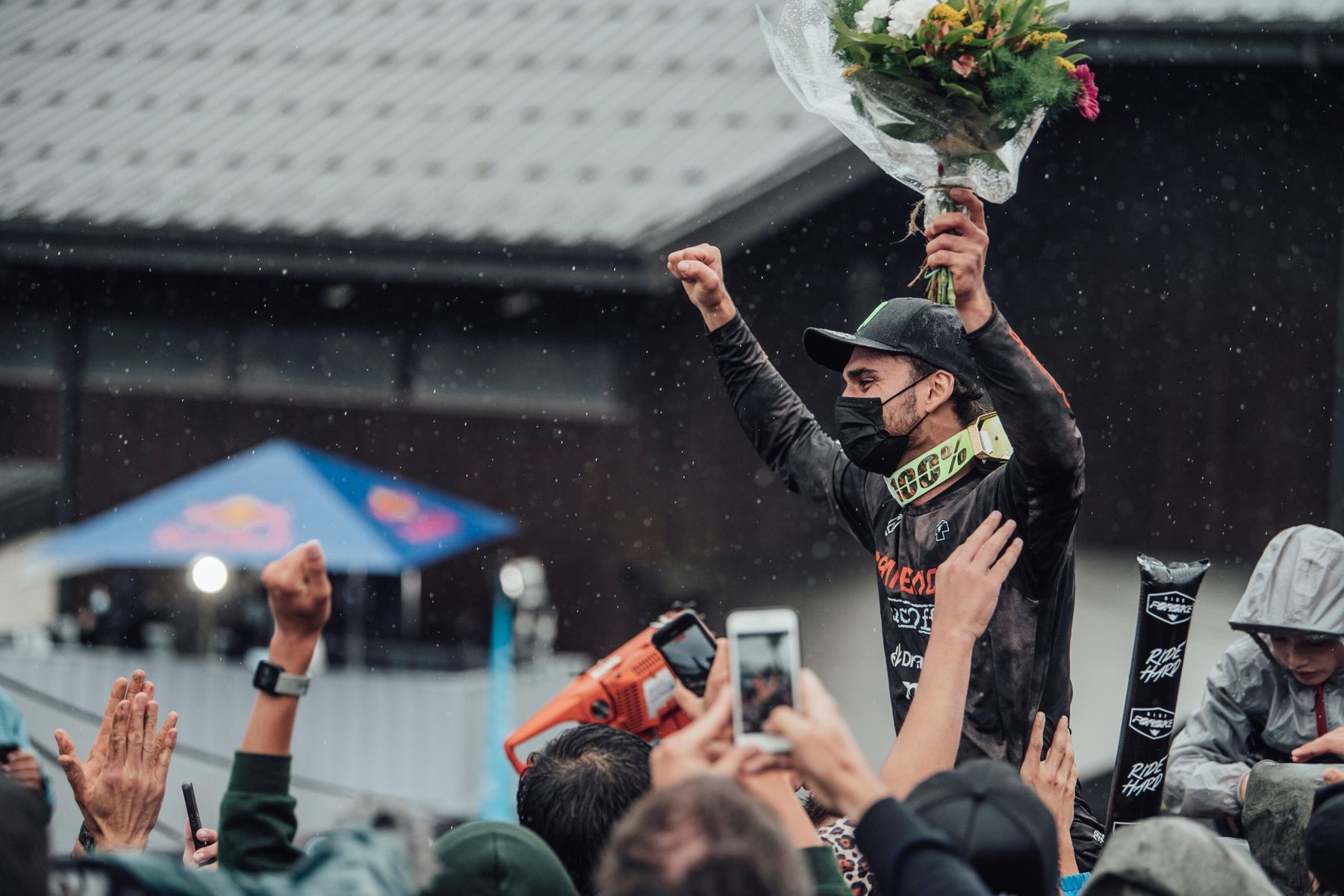 Daprela, having barely managed to eat anything all week, seeded 33rd and in doing so set off early. He crossed the line two seconds up on Max Hartenstern with what looked like a solid Top 10 run. As well as bringing the fire he also brought the rain and by the time the final 10 riders dropped in, the track was a completely different animal and no one could get near Thibaut’s time, giving him his first World Cup victory. Amidst the carnage was perhaps the most memorable image of the whole season: Reece Wilson’s entry on to the piste. Bucked on take-off from the final jump he had a huge over the bars and in doing so earned the nickname ‘The Flying Scotsman’.