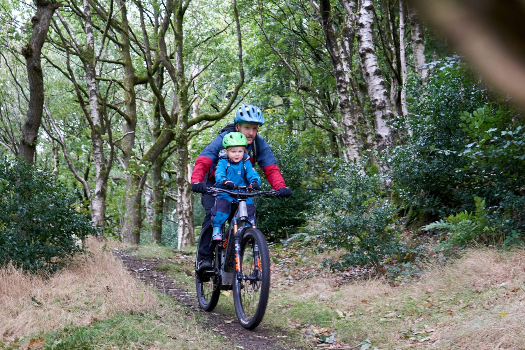 While putting a small child in front of a fully grown adult on a moving mountain bike might seem a bit risky, in practice it works really well. You can keep a watchful eye on your passenger, their extra weight is much more central and easier to manage than on a rear seat, and they get a much more fun, engaging experience than if they’re just staring at your back.