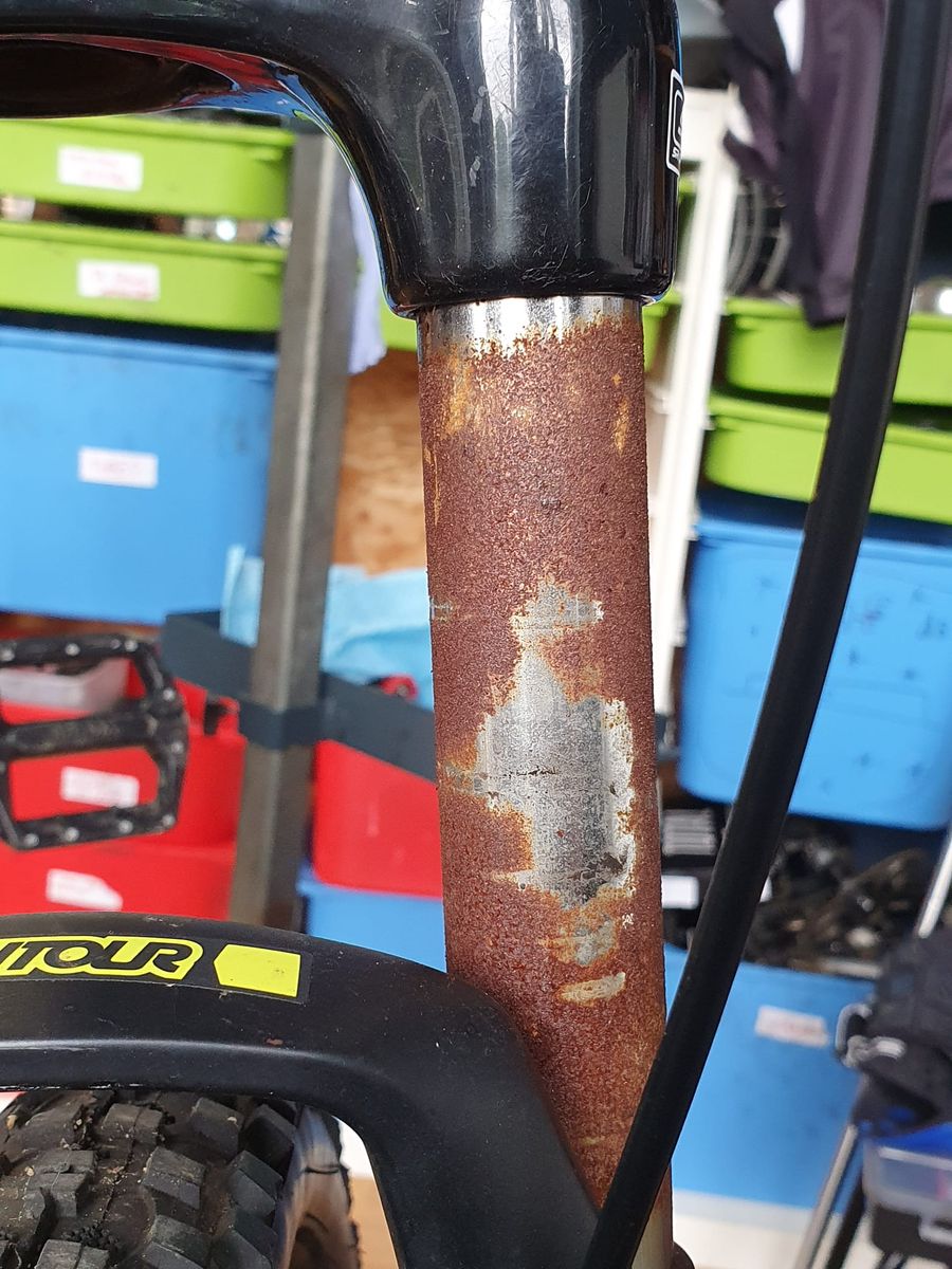 Last up this time round is these budget suspension forks on two matching bikes that came in for service, both with a matching patina of rust coating the stanchions. The customer was asking about the possibility of converting them both to rigid forks as he’d given up hope for these.