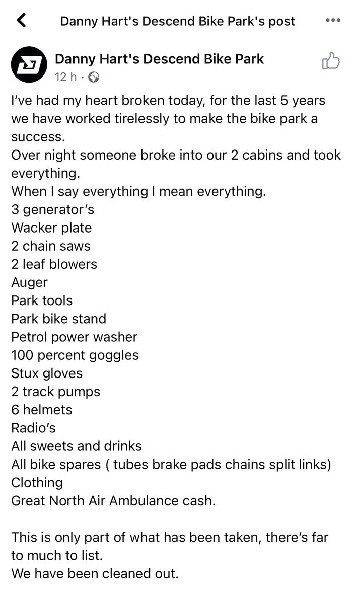 Danny Hart posted on the Descend Bike Park Facebook page that overnight on Sunday their cabins were broken into and everything taken. He’s provided a long list of items stolen, and the bike park will be closed this week, reopening on Saturday, while they clear up and regroup: