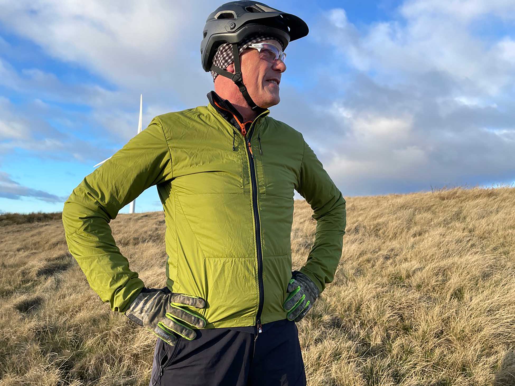 This is the Insulated Jacket 3.0 – and by ‘insulated’, Albion means ‘the absolute bare minimum’ which means that the jacket is very light and packs down very small (into a road jersey pocket or a bum bag). The jacket is mostly very, very thin DWR treated (bluesign) nylon for windproofing and features Clo Eco Vivo recycled insulation over the upper arms, shoulders and chest. Now is the time to be testing this kind of stuff, so we’ve got Chipps hugging a windmill on the top of the hill until he’s had enough. Incidentally, as it’s a slim-fit road jacket, it uses ‘punishment sizing’, so Chipps is an XL. Luckily there are sizes from XS to XXL