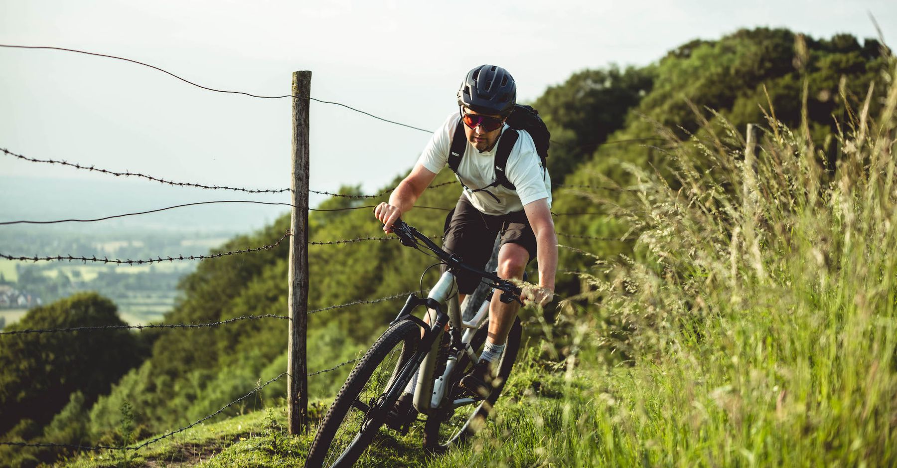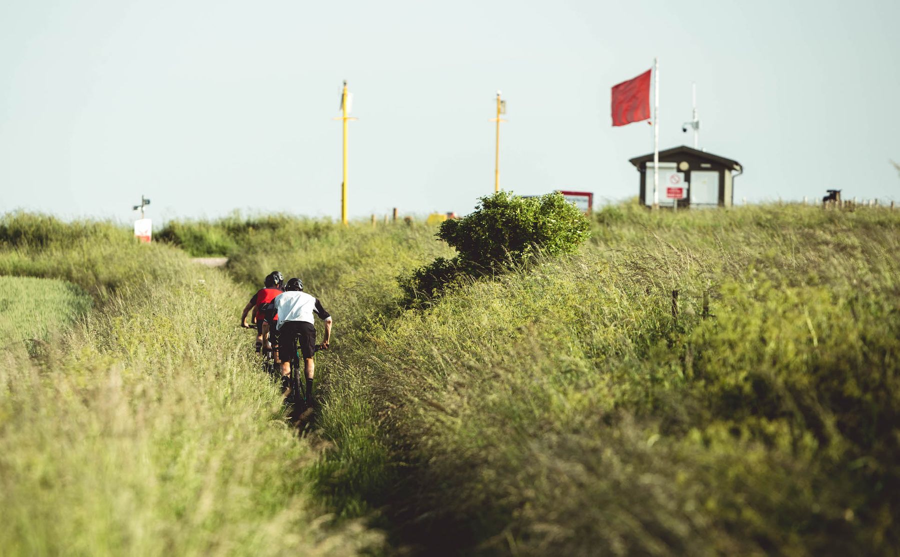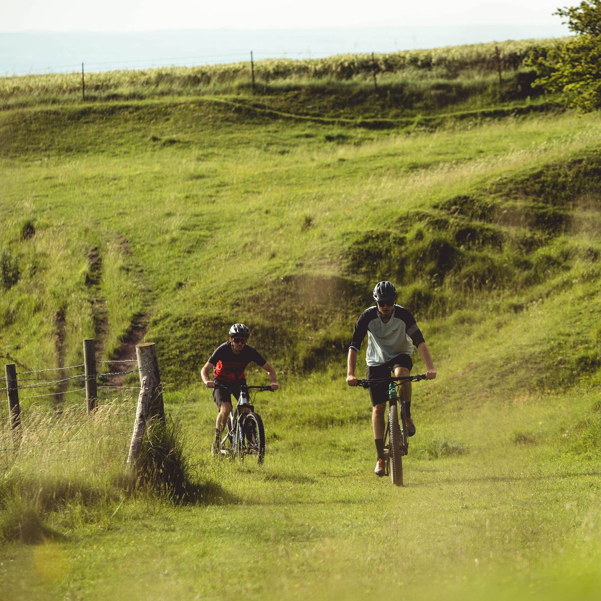 Heading for a wood in the distance, it’s not long before my wheels start to roll faster. The gaps between our bikes are opening up; we let the brakes off and pop off a small drop, kicking up dust for the rider behind to inhale. The long grass either side of the singletrack is buffered flat as each of us blasts past. Just as I’m really getting into my flow the trail abruptly swings left. I struggle to slow the bike down, tyres scrambling for grip. As I lean into the corner I release the brakes and my enthusiasm almost outweighs my talent, my tyres squirm and the rubber drifts across the grass. I only find grip at the very last second and my hand comes precariously close to the barbed wire fence. A very close call. Traversing the hill, back out in the golden sunshine on twisting singletrack, overgrown from a summer of growth, my close call is still foremost on my mind. My concentration dwindles and I clumsily clatter my gloveless fist through a huge bunch of stinging nettles just to make sure I remain focused.Â