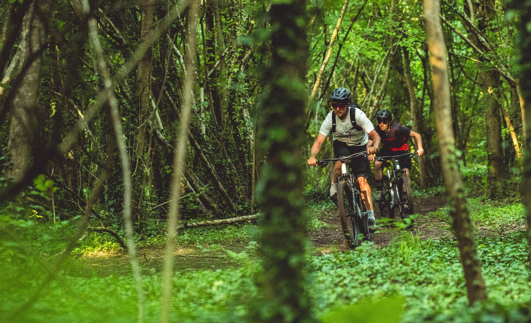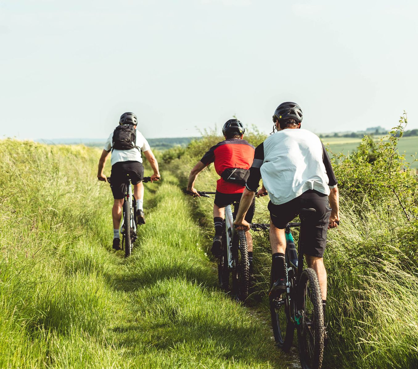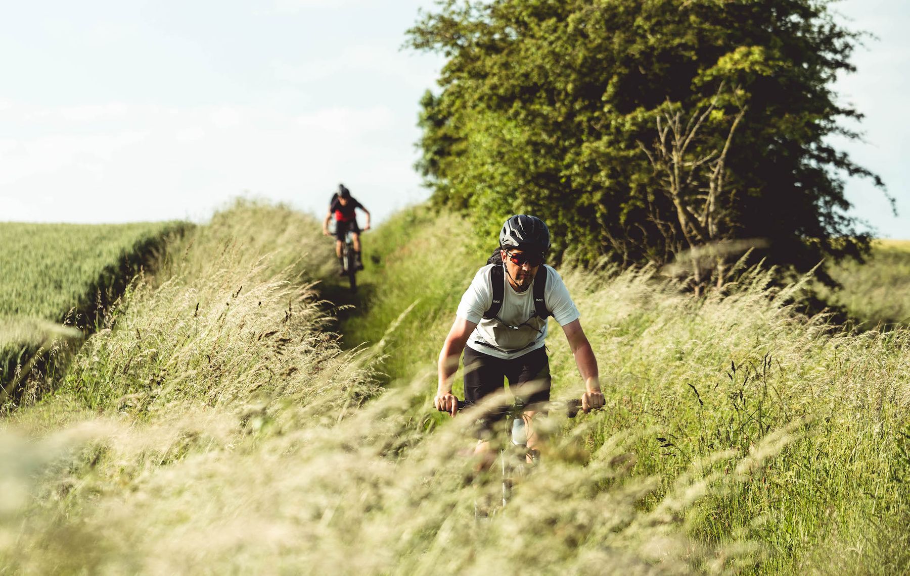 With the car park barely out of sight and no chance of a warm up, the four of us embark on the first climb. Setting off at a calculated pace we spin our way up the stone and gravel bridleway underneath a canopy of trees that shades us from the early evening sun. It’s a kind and gradual gradient to start with, but as we round the bend it begins to kick up. There’s a cacophony of simultaneous clunks from our gears as we creep our way towards the biggest part of the cassette.