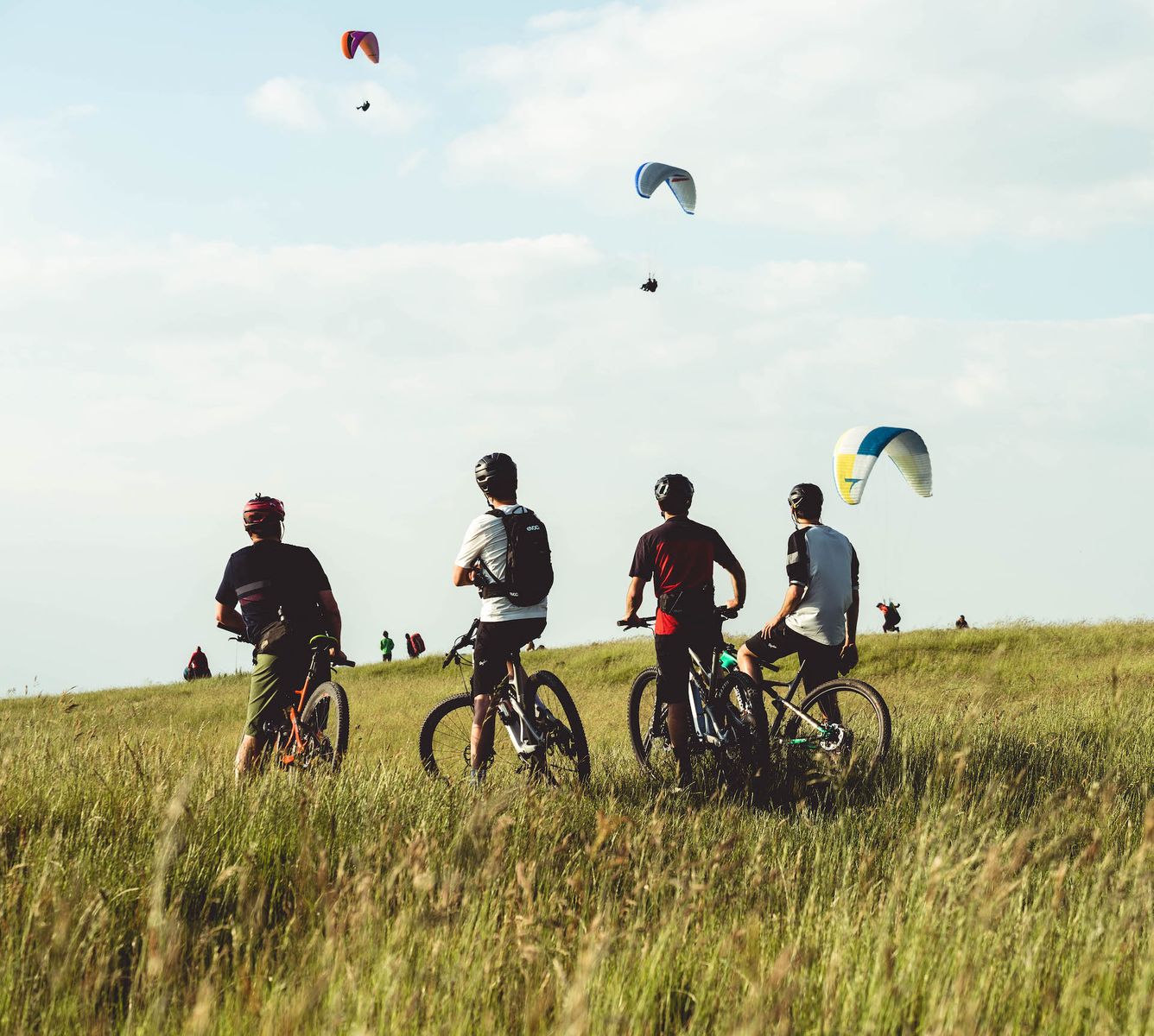 We make a hard right turn at the junction and head west along the Imber Range Path. With few trees on the Plain there are uninterrupted vistas over the green fields and Westbury ahead. After a gentle bimble along a short section of the larger 48km circular route that is the Imber Range Perimeter Path, Nick veers off to the right and dismounts at a gate. Intrigued, we all follow, and take a short walk through a grassy field until we hear the sound of a flapping sheet and hollering. A dozen paragliders are in flight right above us. We stare with bemusement, heads up and mouths open wide, looking into the evening sky. Some are flying in tandem, others are solo, completing loops and acrobatic rolls. We’re suddenly disturbed by a lone paraglider swooping down, literally skimming the long grass with his feet and bum. We duck out of his way and beat a retreat back to the gate while discussing which of us are daredevil enough to be up in the air floating on thermals.