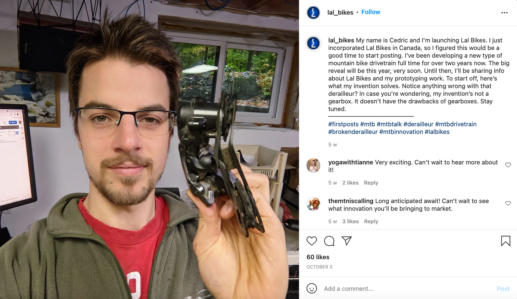 Lal Bikes will manufacture the derailleur, chain tensioner, and idler pulley in Canada (and maybe also in Europe later on). These parts will be sold to bike companies that spec the Supre Drive, and also directly to mountain bikers, etc. Lal Bikes collaborates with mountain bike companies in the development of frames equipped with the Supre Drive.