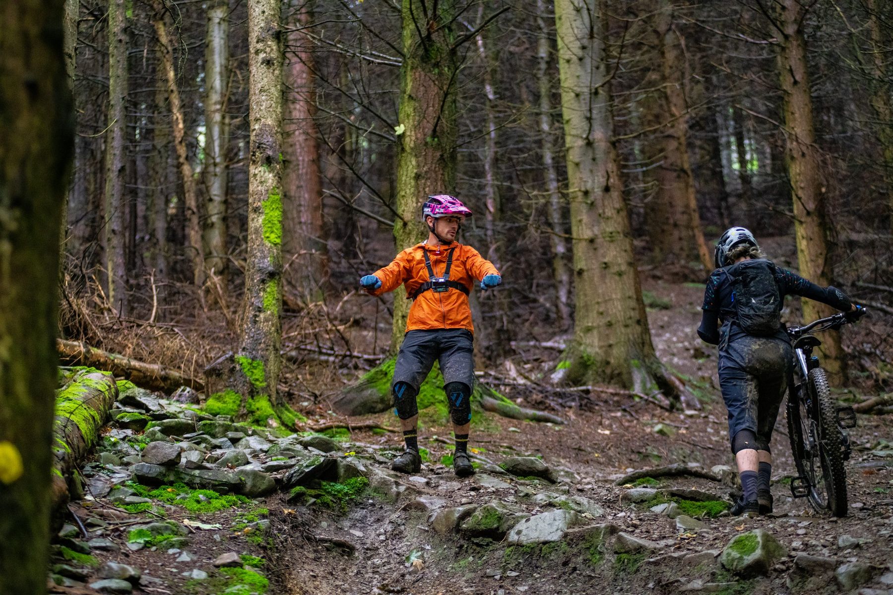 We make our way back up to the top of the trail to do some drills. We arrive to find Harry Main and friends wondering whether to steal my sunglasses. I reclaim the glasses I managed to forget to put on and consider this proof that I wasn’t going very fast if I didn’t manage to fling any muck up into my eyes. Elliott chats with Harry about why they’re both up here and not in their usual localities. There’s a bit of chatter about possible ebike training sessions, then Harry and friends head downwards and Elliott show me a drill that should help sort out my turns.