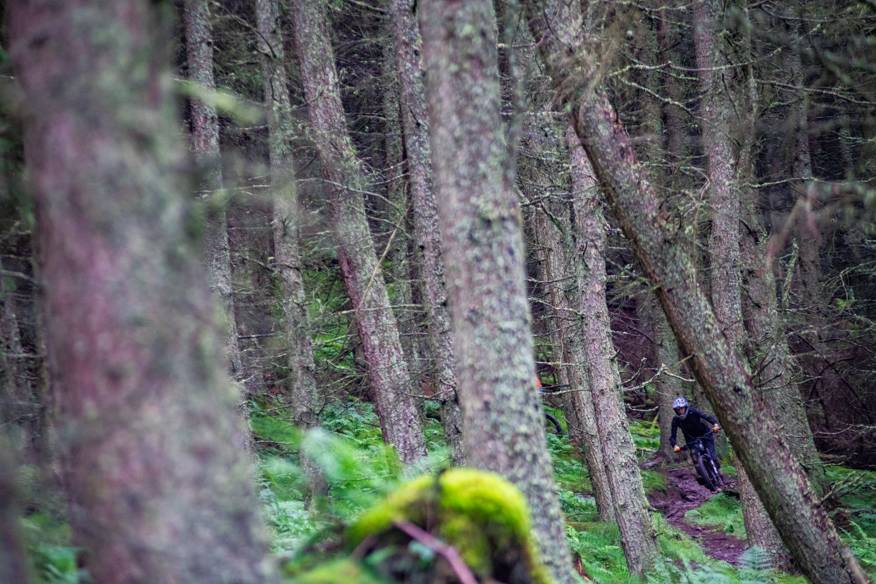 I’m keen to try and find a drop or even a jump to work on, but as we’re all on unfamiliar territory we’re not sure exactly where such features might be found. We decide to head down through the woods, riding whatever we find, and seeing what I get stuck on. I lead the way, with Elliot following on behind, now mostly shouting words of praise and encouragement rather than reminders and instructions. He sounds genuinely pleased and impressed with the improvements I’ve made, which only adds to my pleasure as we ride trails downwards and blind. With every turn I do the tip/saddle touch/look where I’m going to go routine, and find myself wriggling my way through the trees. As I wriggle, I giggle and for the first time in a long while as I’m really enjoying what I’m riding.