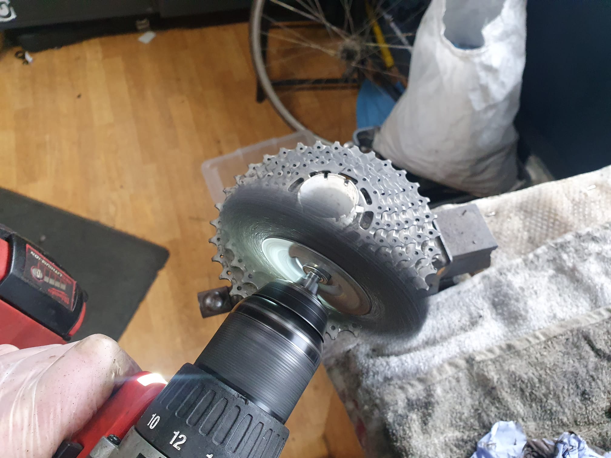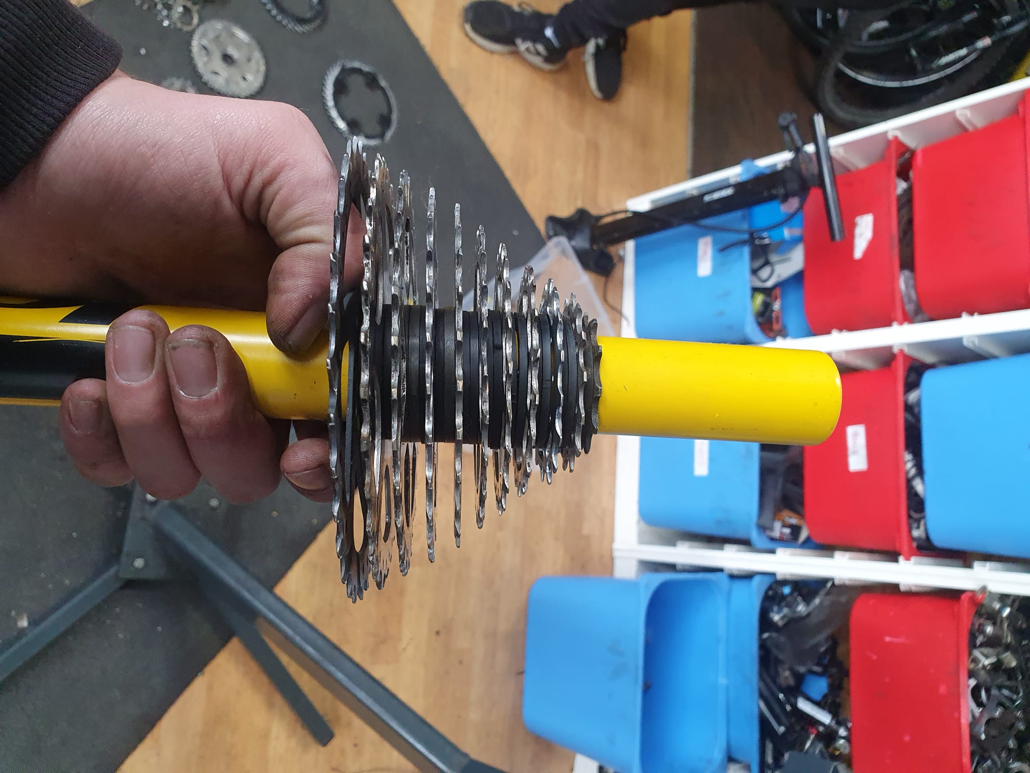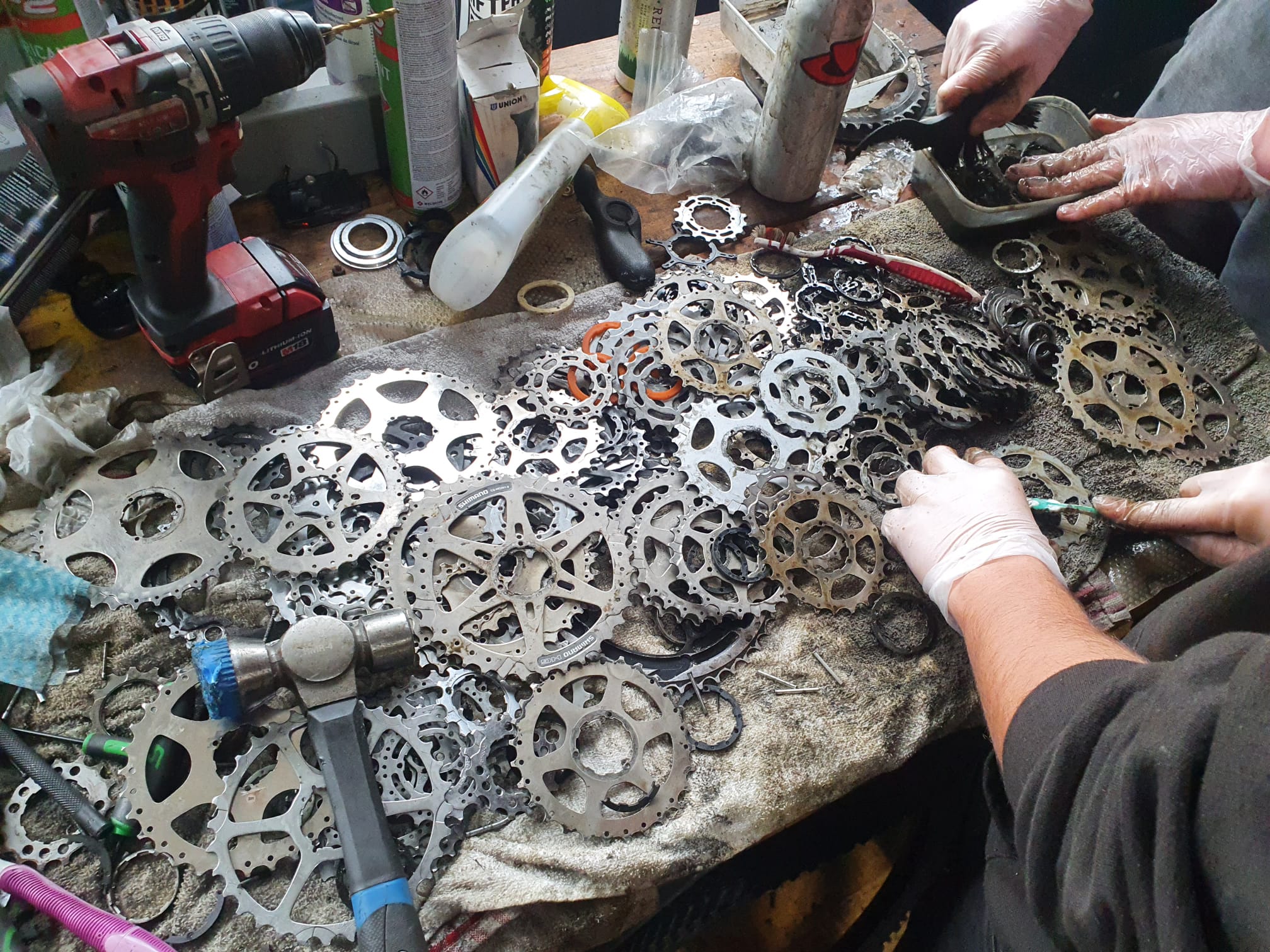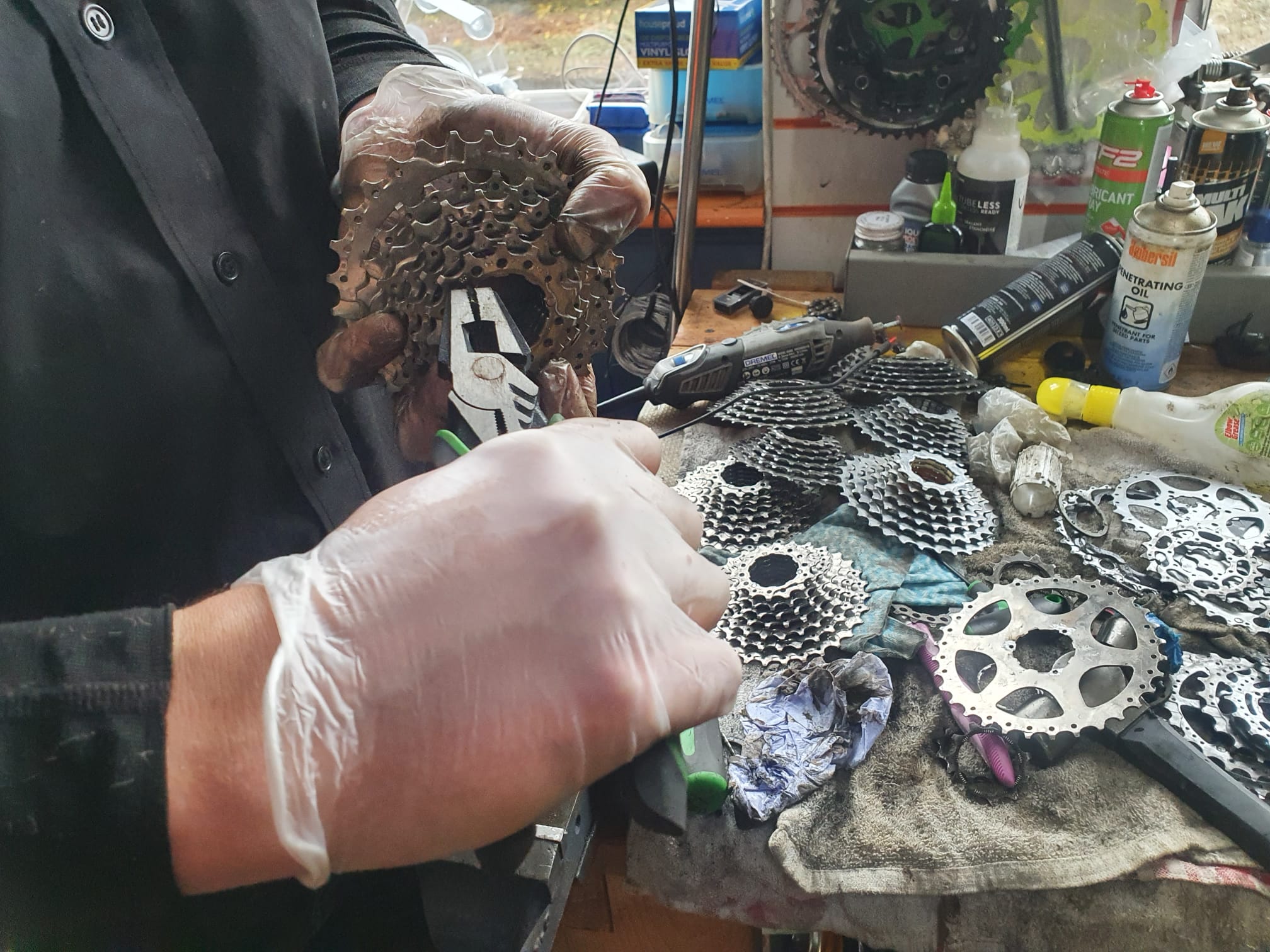Next task is to remove the pins joining the sprockets together, a quick job when you’re stripping one cassette can become a real drag when you have to do it 20 times in a row…
