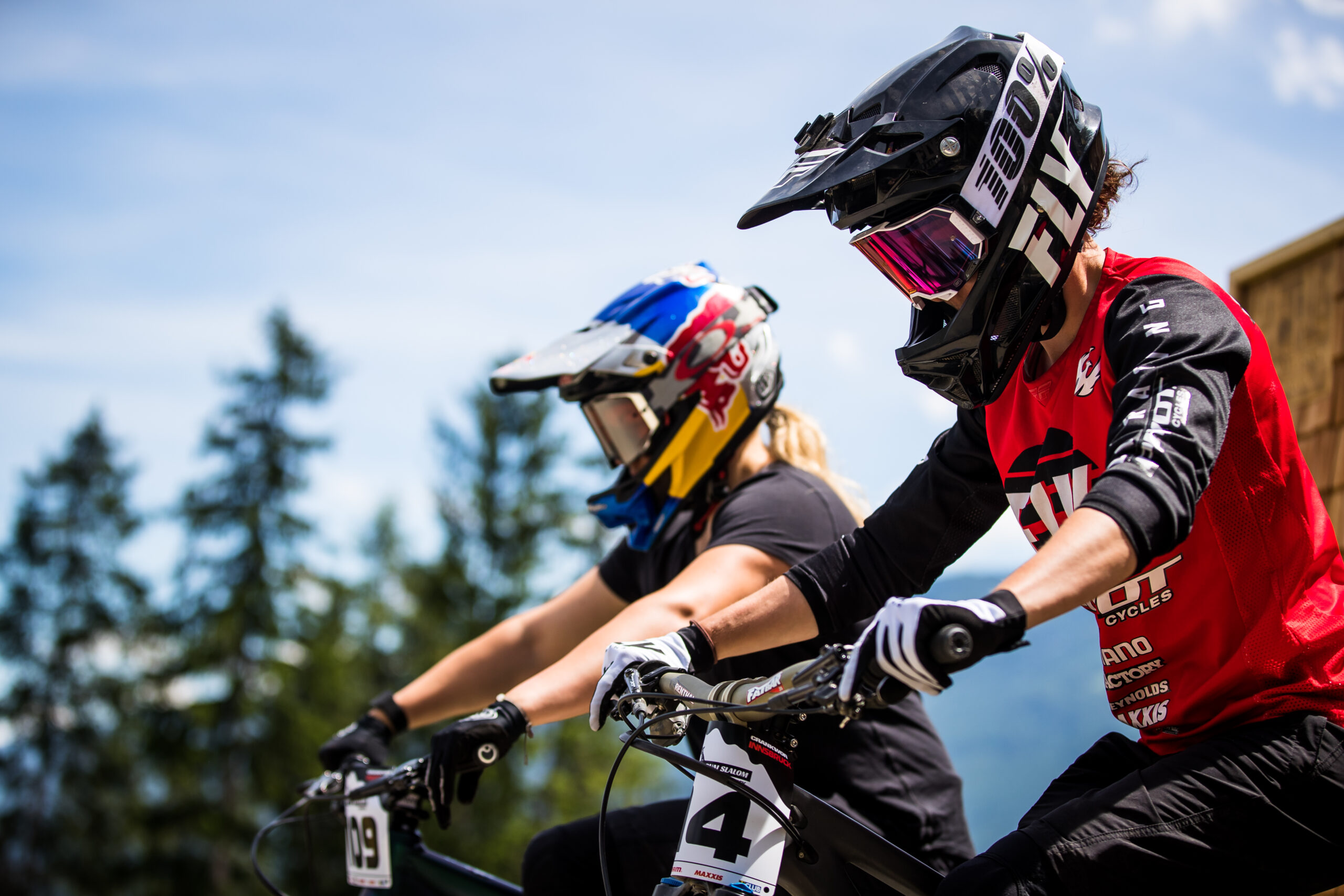 Vali Hƶll and Emilie Siegenthaler in the Startgate at Crankworx Innsbruck Dual Slalom June 17, 2021