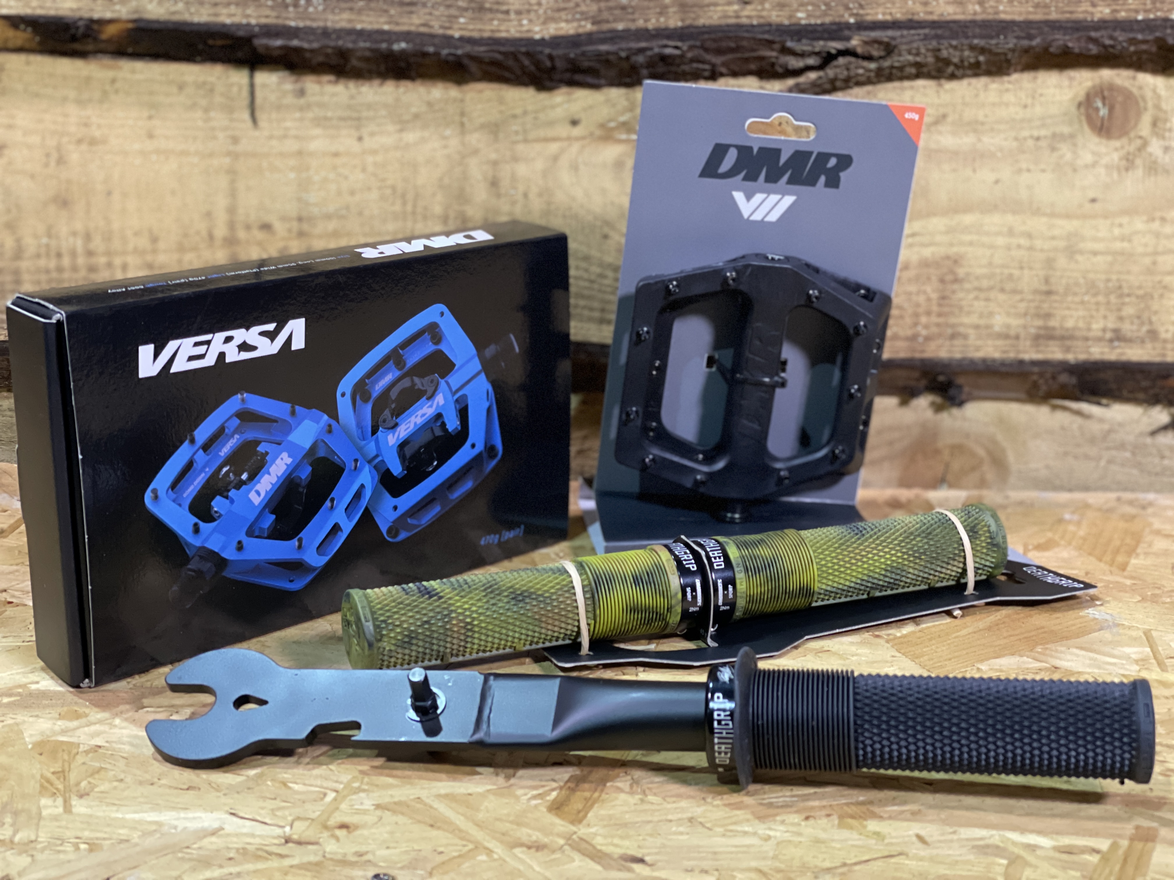 These pedals come in five colours, but you’ll be getting this goes-with-everything silver pair. And they really do go with everything – clipped or flat shoes too! One side lets you ‘grind up’ clipped in, while the other lets you ‘bomb down’ on flats if you choose – this message is even engraved on the pedals. Handy for those ‘will I make it’ trails where you want the confidence of an easy dab, perhaps. You’ll also get the new V11 pedals, which use the same shape as the ever popular CNC’d DMR V12, but are made from a glass reinforced nylon body – letting you ‘turn it up to 11’, hence the name. The classic DMR Deathgrips will keep your hands in control of the bike – they seem to work well for Brendan Fairclough! And a very satisfyingly quality feeling piece of kit, the DMR pedal spanner, will help you fit your new pedals to your bike. If you have to remove your pedals regularly – to get the bike in the car, perhaps – this will make the task a pleasure.