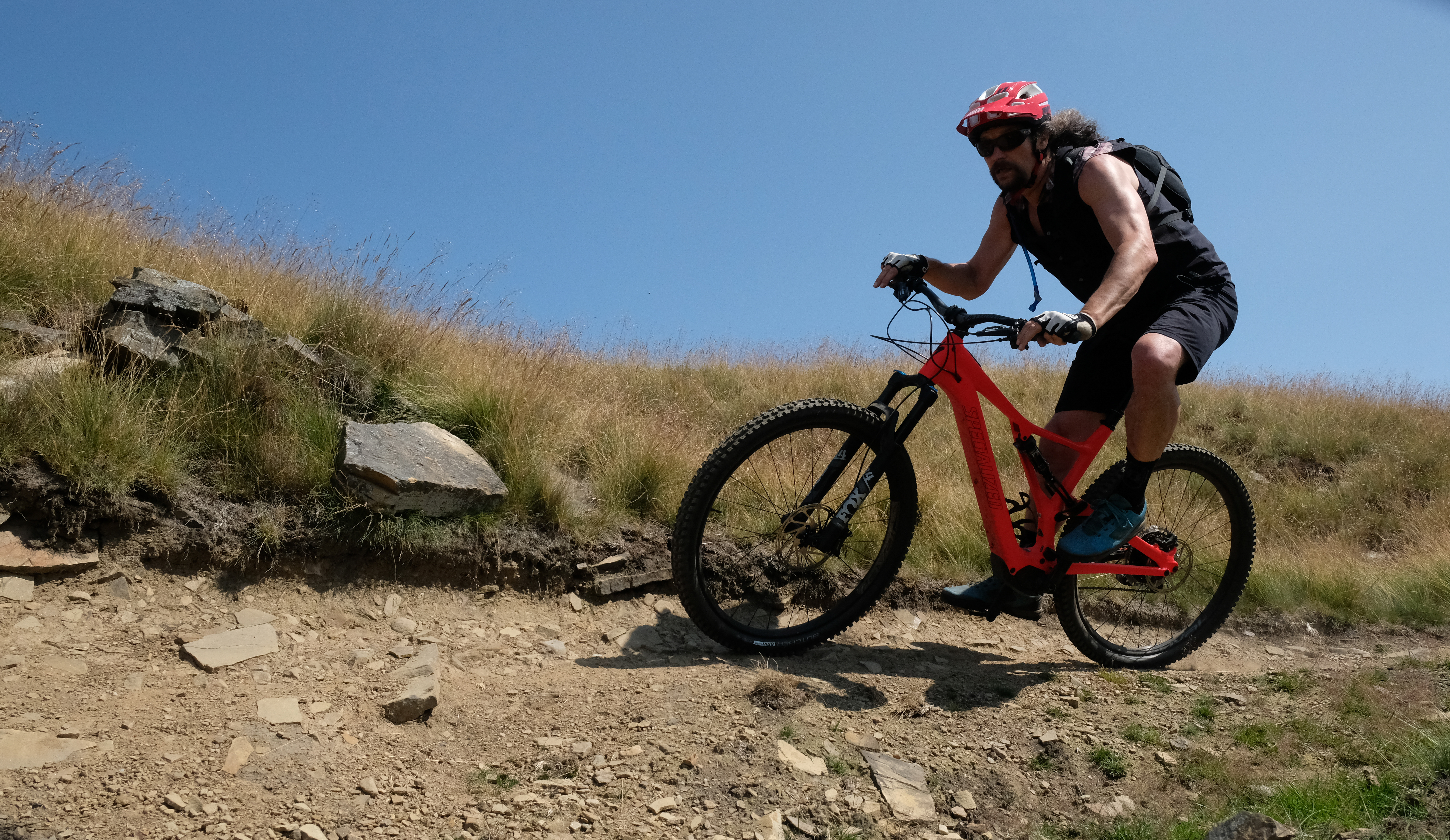 The SL version of Specialized’s Levo has a half-weight powered battery and motor. An e-bike that doesn’t claim massive battery Watt hour thingies or loads of motor power torques… What the hell is that about? It’s about giving you an e-bike that will give you all the help you deserve, with only a 4kg weight penalty, and the same sort of range as a full on e-bike.