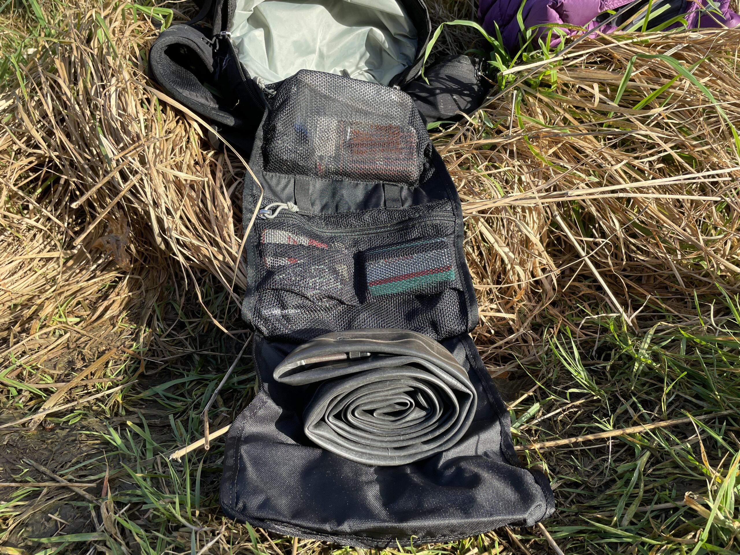 Having got to the tool section, all your tools unroll neatly out in a nice display….or not. The tool section isn’t big enough to easily accommodate the length of my shock pump, and the roll itself doesn’t have a space in which to store my pump. It does have two elasticated loops that look like they would store a pump – but it would have to be of the skinny roadie variety. Maybe it would store a couple of CO2 canisters, but if you’re using CO2 you’ll likely be seriously cursing the time it’s taken you to get to them. If you’re enduro racing, I think you’re going to want the things you’ll likely need strapped to your bike, and save this section for the real disaster situation kit, like spare mech hangers, 3rd and 4th CO2 canisters, chain breakers and quick links, and so on.
