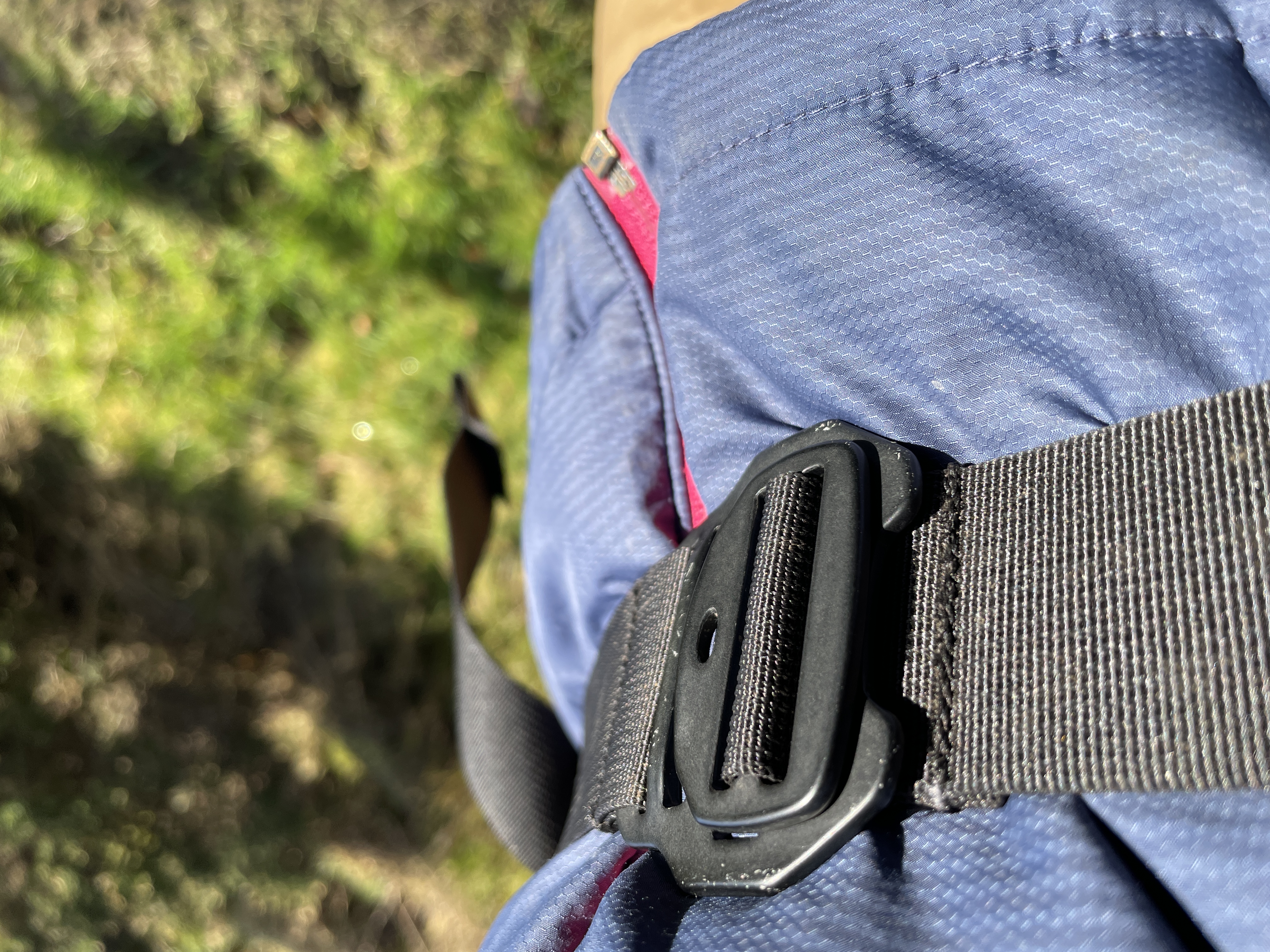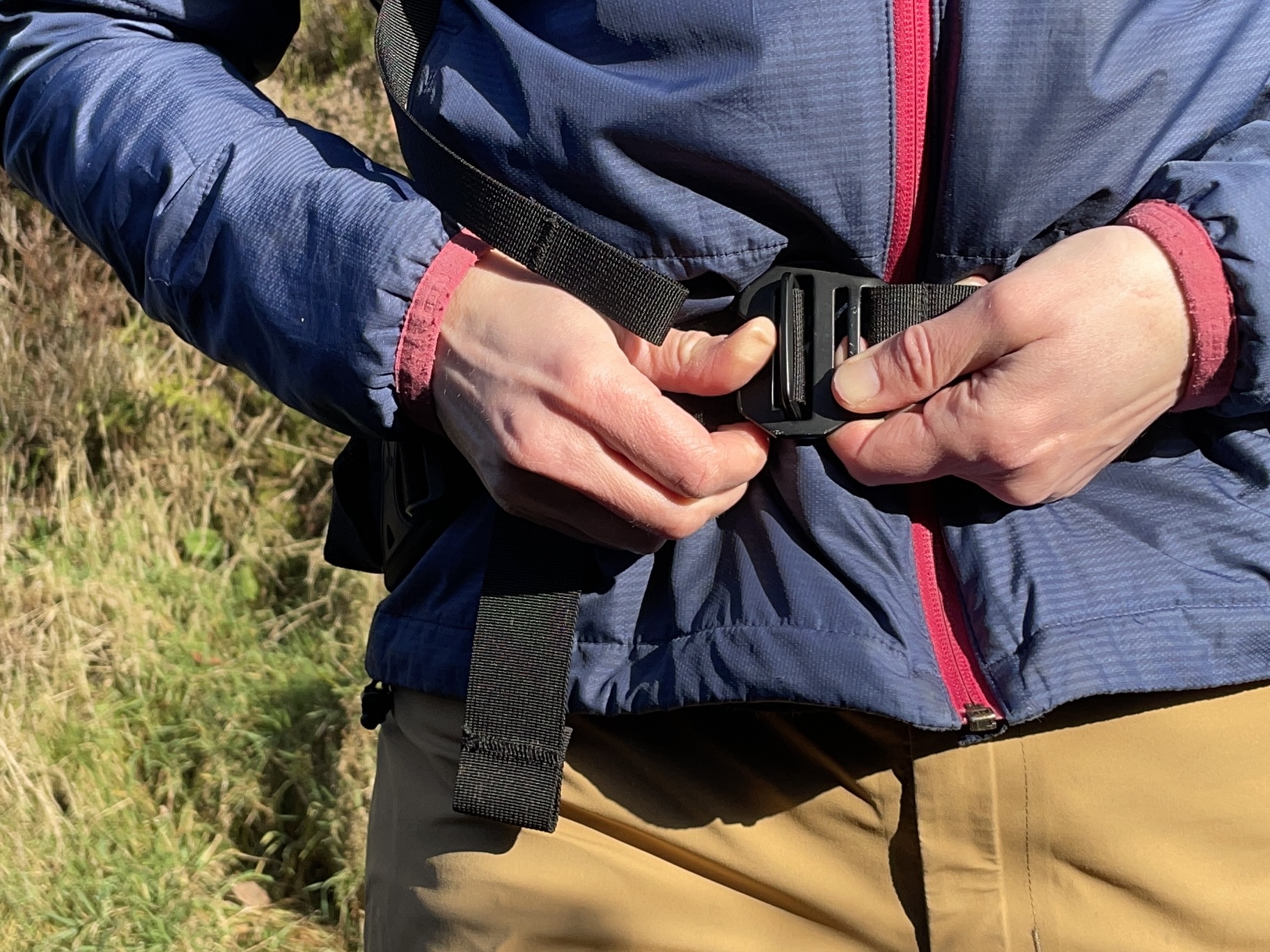 The metal waist strap fastener is fiddly and difficult to operate, especially in winter gloves. It does offer plenty of adjustment, since you can loosen or tighten the strap from either the left or right hip, however actually threading the metal clasps through one another requires close attention – you can’t do it by feel like you can a standard clip. Also, if you tighten it up so it’s really holding the bag firm, you need to loosen it to undo the clip and remove the pack. So, it holds everything down nicely, but it’s a bit like putting on a Duke of Edinburgh expedition pack – once it’s on, you don’t want to remember you still need to add your keys to the pack.
