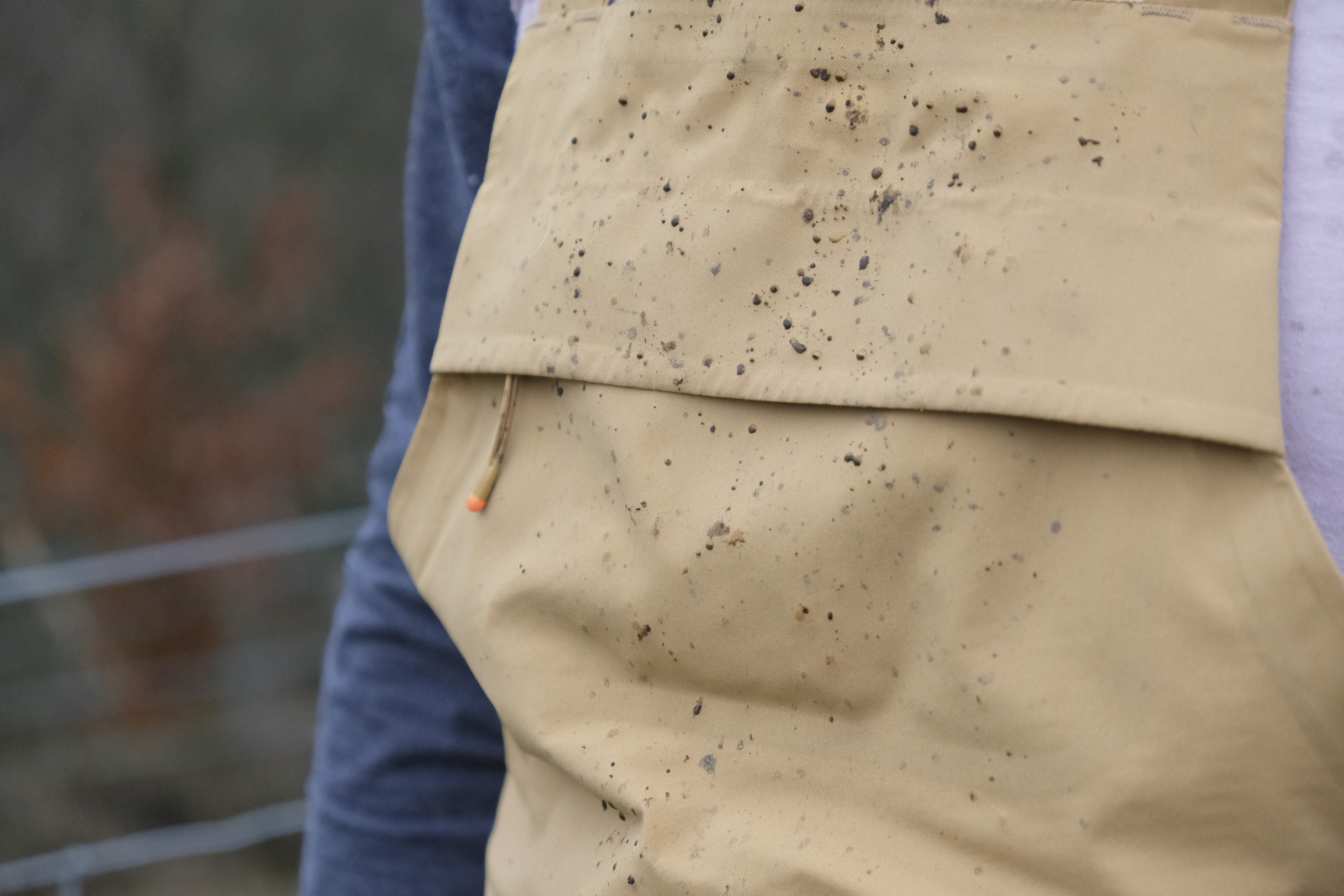 To date, the dungarees have held up well, though at the price you’d hope so. I’d love to see some extra reinforcement or super tough material around the seat area, as this is where all my other waterproof bottoms tend to fail first, by rubbing away along the seams. I’d also like a different colour – the desert sand colour is not a great match for trail mud and they’re rather stained.