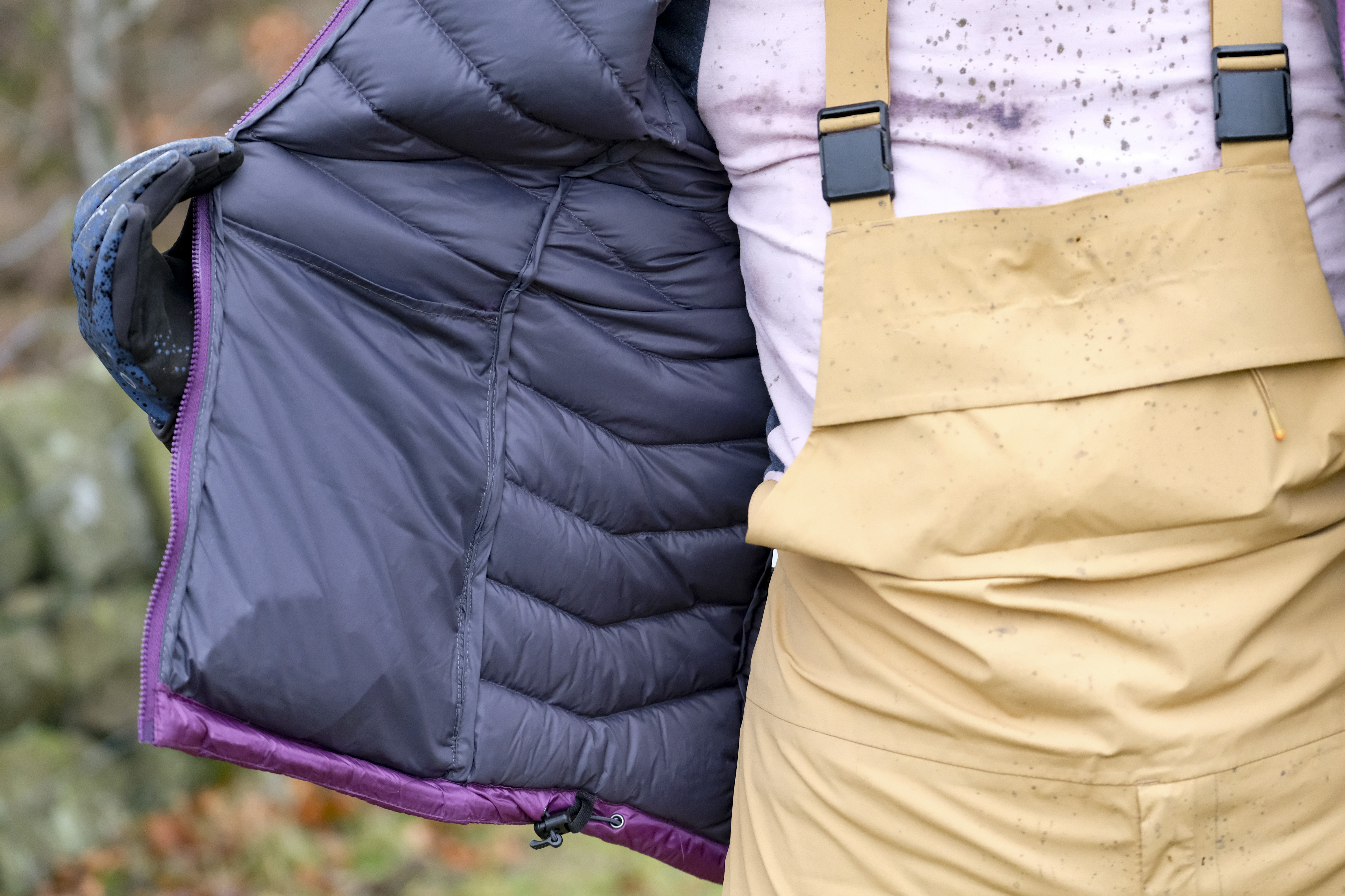 They are designed to be fully waterproof dungarees, with taped seams throughout and a 3-layer fabric waterproof to 15,000mm. You zip yourself into these dungarees with two long side zips that extend to the thighs where they can open up for ventilation. A popper faster ensures the dungarees stay done up at the top of the zip, and an adjustable waistband across the small of your back gives some waist adjustment. Further zips on the thighs reveal pockets for a phone, and a teeny tiny pocket for a credit card or uplift pass. A zippered pouch on the bib of the dungarees offer further storage space.