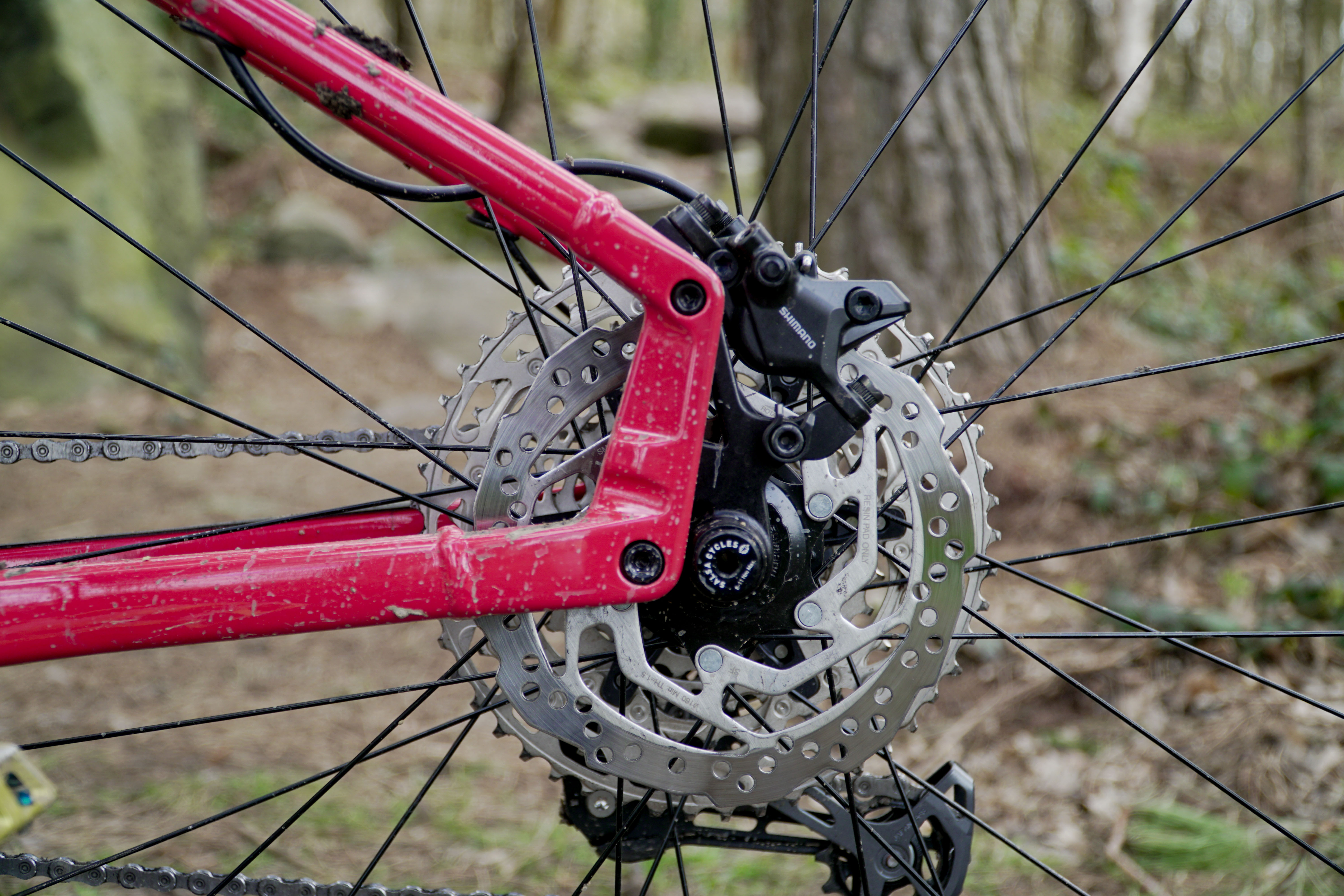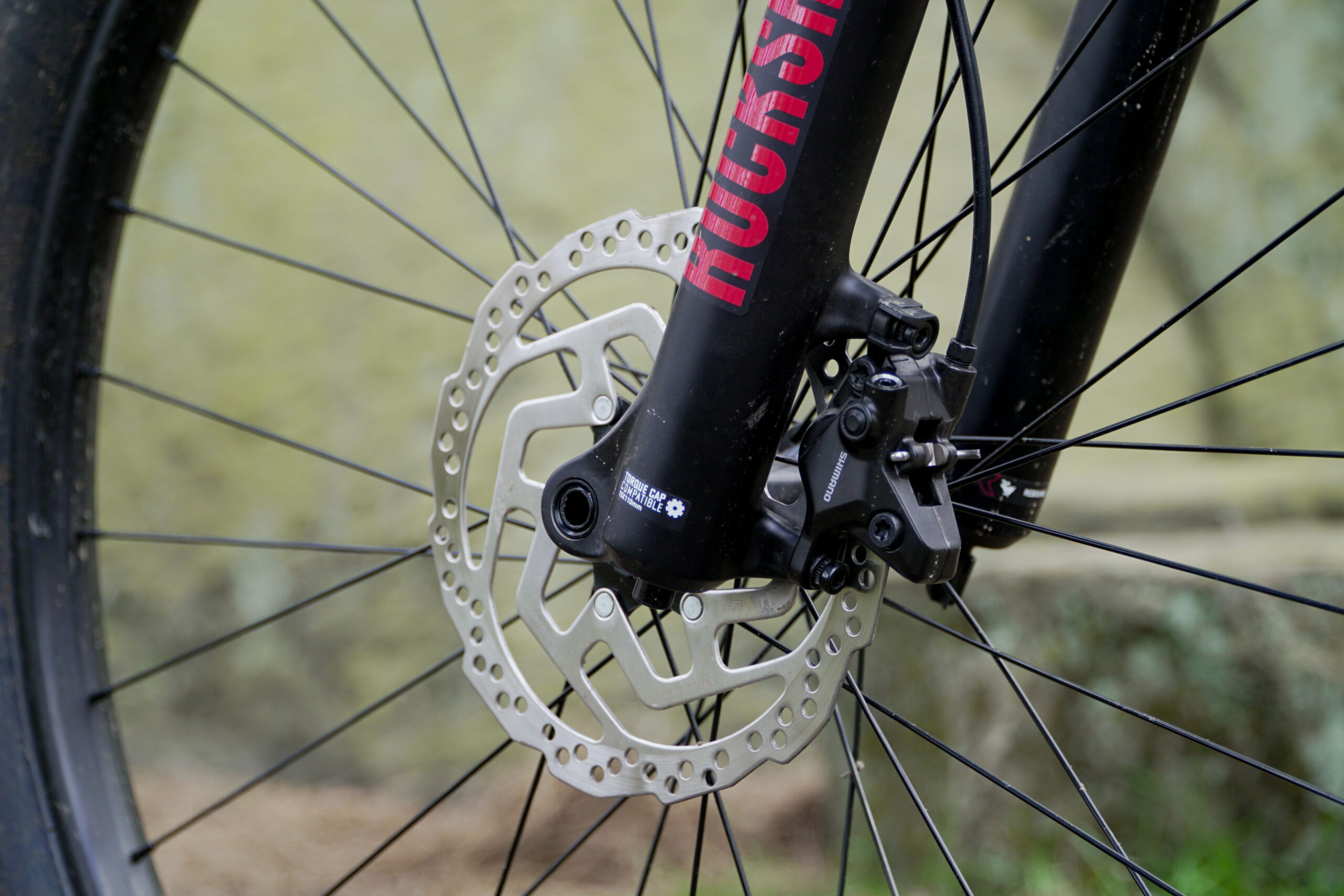While the adjustable chainstay is genuinely effective and easy to use, the adjustable dropper is easy to use, but I’m not sure that it’s especially useful, unless you’re as short as it’s possible to be for any given size of frame. The fork isn’t as tuneable or as plush as the higher-end models we so often ride, but it’s adequate on groomed trails or rolling bridleways. If you start hitting especially rocky sections at speed or even bigger drops at low speed, you’ll feel the lower quality of the fork. Here, you’ll find that you’re pinging around some rocks rather than steamrollering over. But that’s OK – making choices about lines is fun that’s all too often lost when a bike is doing all the work. Better brakes would definitely be welcome – after a long descent you’ll have tired hands and wrists, even without loading the bike up. They don’t have the squeezy cheese feeling of some cheaper brakes – they just feel like they need more than one finger to haul on them.