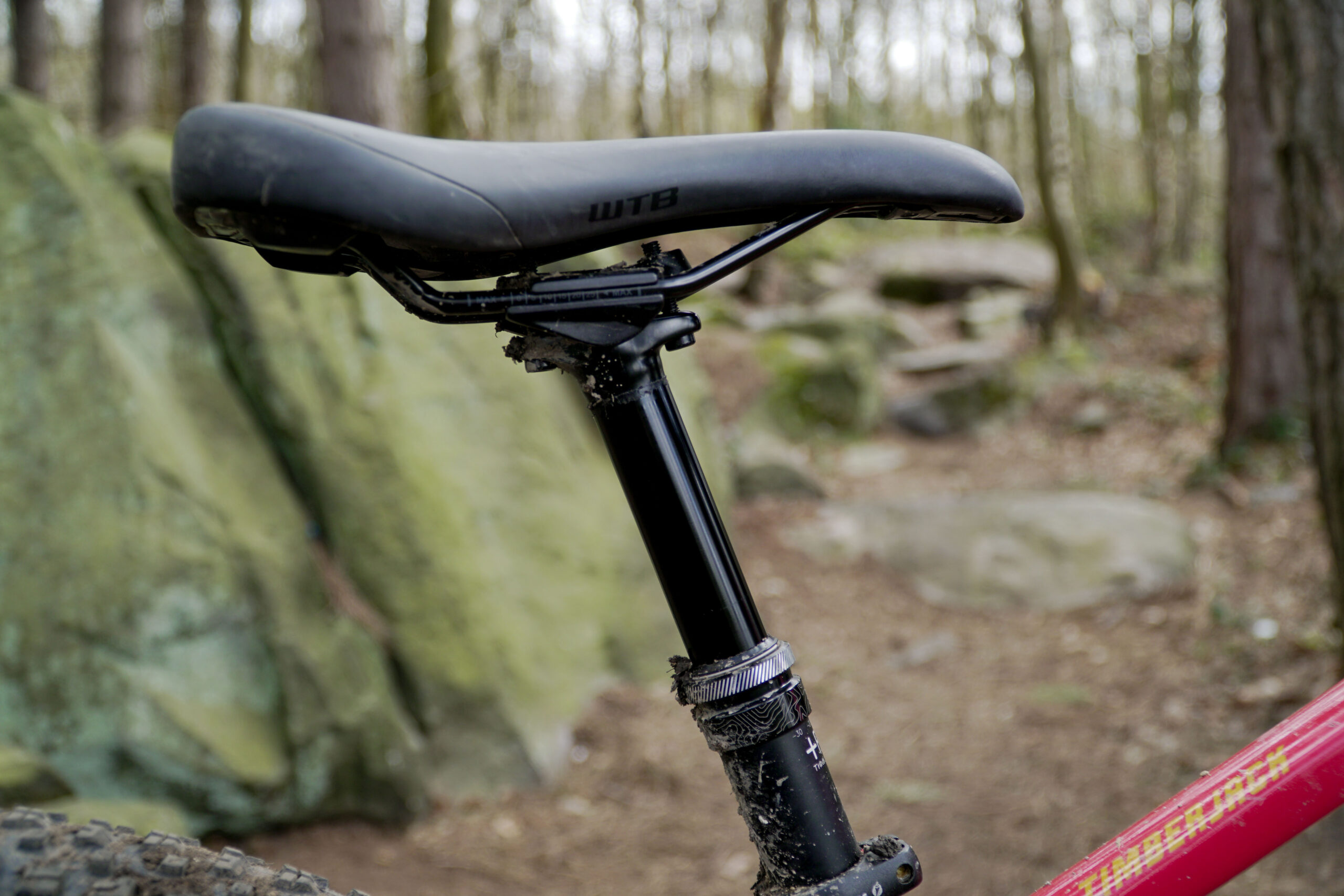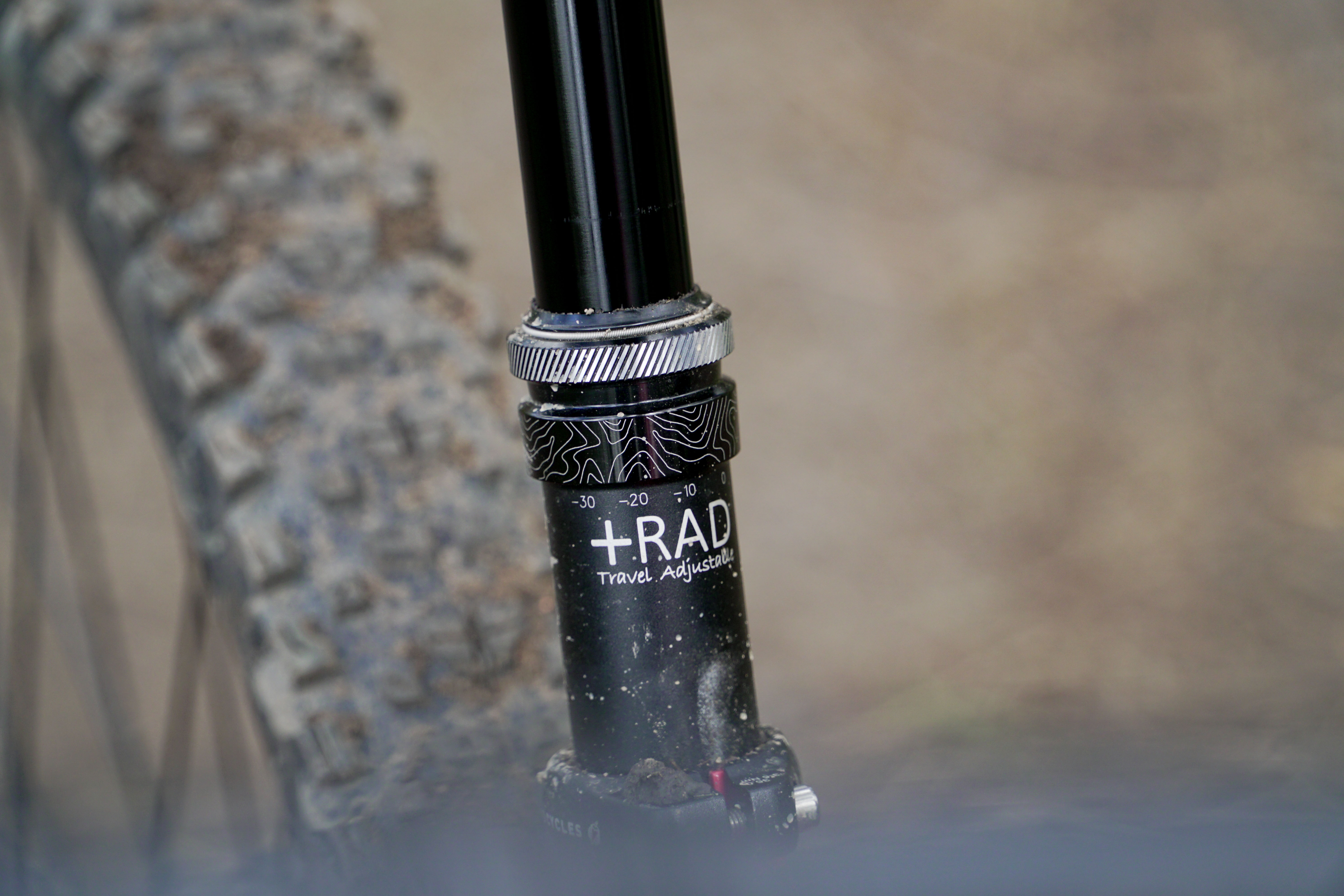 To remind us it is a Salsa, you get a pair of top tube bento box mounts and three bosses on the down tube. The chilli/tomato red frame we have here is the SLX build kit option, with 130mm RockShox Silver RC35 air fork, Shimano SLX shifters and derailleur, Shimano MT401 brakes, and TranzX travel adjustable dropper post. The dropper length varies with frame size, and our medium has a maximum 150mm of drop that offers tool-free adjustment in 10mm increments up to 30mm. It seems clear that there have been a couple of compromises in order to get this Timberjack in on the budget of the casual adventurer, most notably on the brakes. They work, but the ergonomics are a leap away from the single-finger-friendly levers we’ve become accustomed to and are even described by Shimano as an entry level mountain bike brake with two-finger lever. The fork too is a little less plush than pricier models, but at the ‘trail’ end of things rather than ‘enduro’ it’s fine.