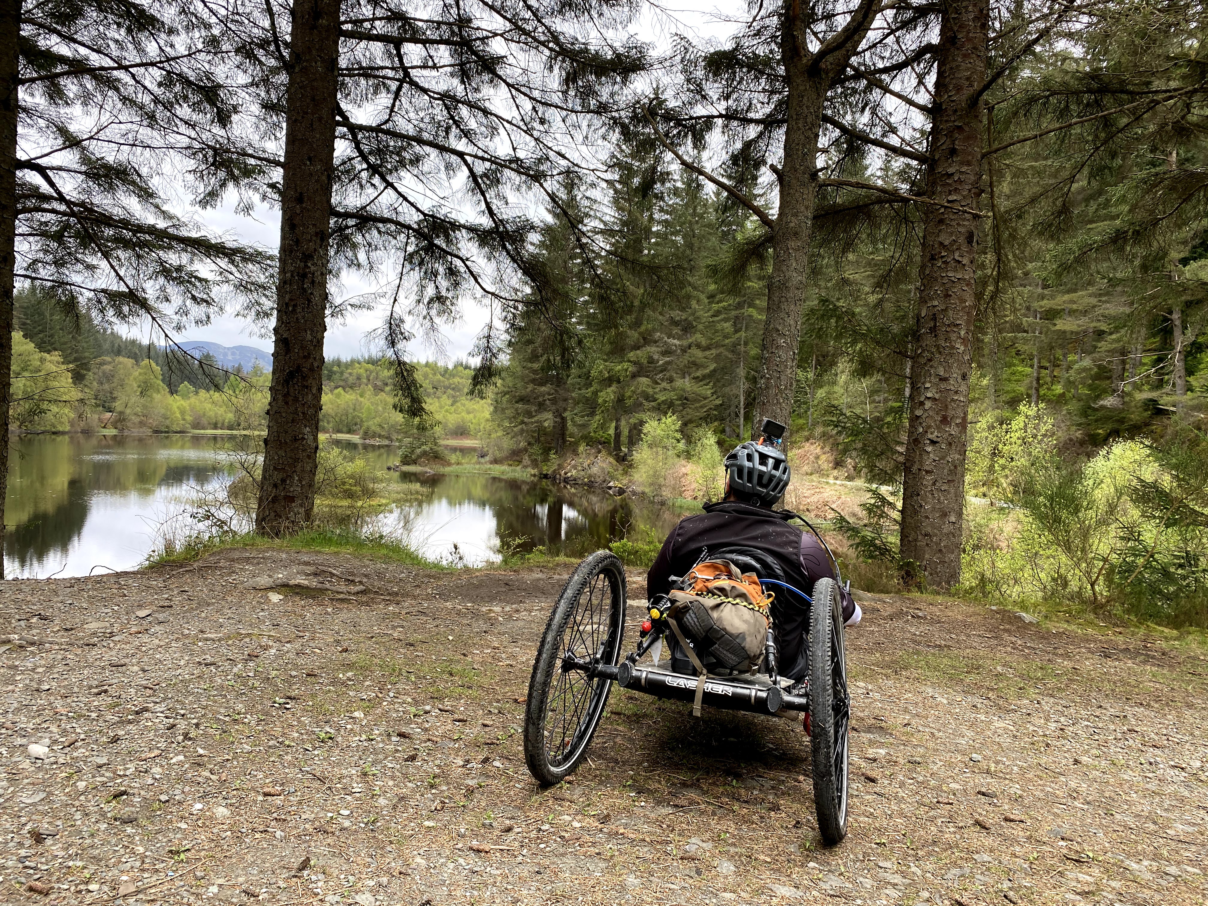 Just like his non-disabled riding friends, Neil recently caught the bikepacking bug, and he’s caught it hard. “Seeing able bodied riders going off bikepacking I thought ‘There’s an independence and self reliance that I would like to have’” – so off he went! “My favourite overnighter was from Loch Laggan to Corrour Station with a swim in Loch Ossian on the way.”