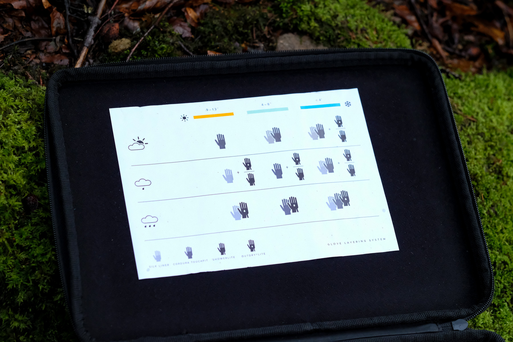 What you get with the Dissent 133 Ultimate Glove pack is four different gloves – a silk liner, a knitted ‘Cordura touch fit’ thermal glove, a ‘Showerlite’ soft shell outer, and an ‘Outdry Lite’ waterproof outer. The idea is that you can mix and match the layers according to whether it’s cold and wet, warmish but windy, warm and wet, and so on. The gloves come in a substantial case of the type you might keep a laptop in, which seems like overkill but does look posh, and there’s a guide inside the box as to which layers you should pick for different weather conditions. I had the size medium kit on test, but also ordered a small kit to try on for size comparison.