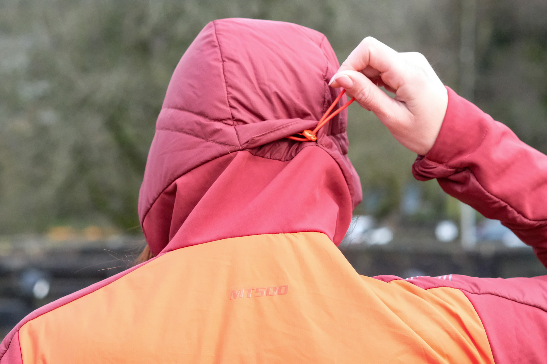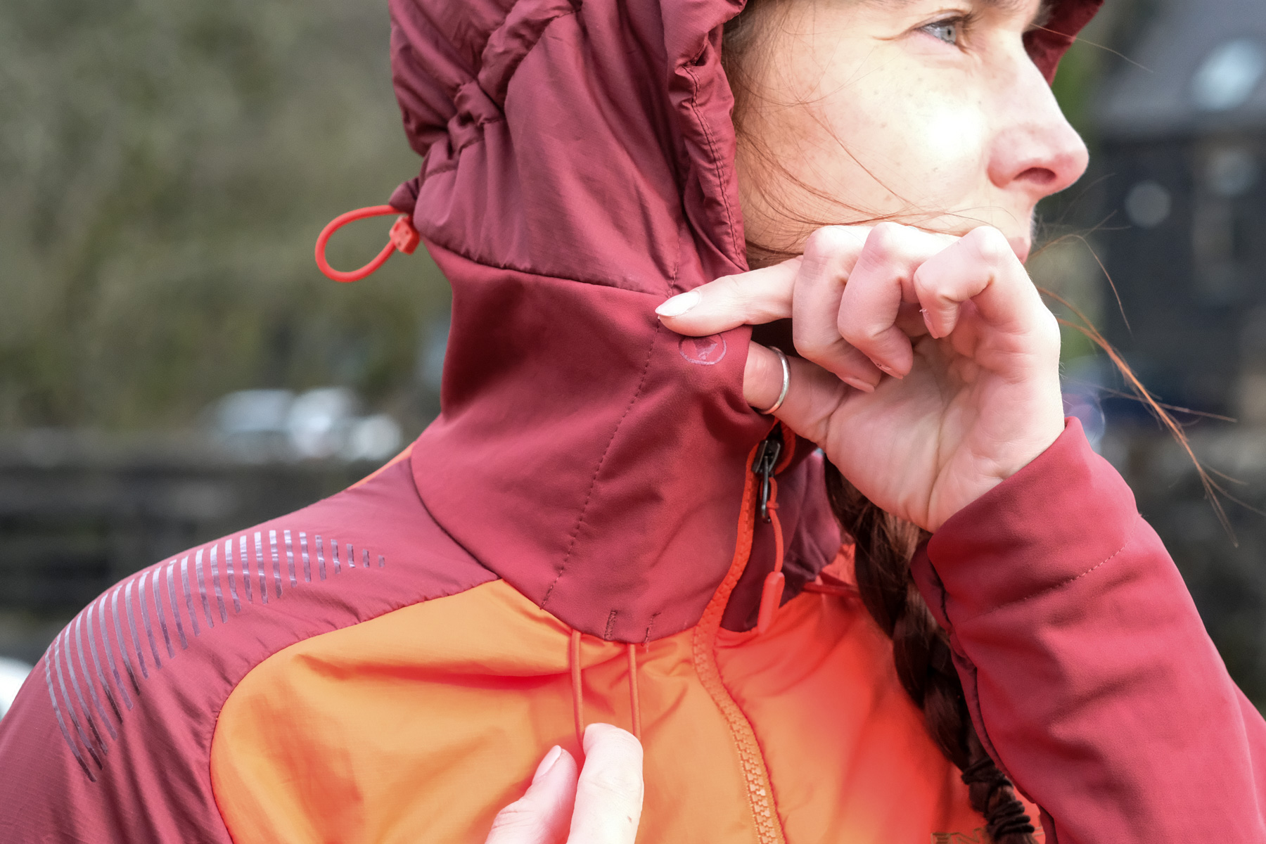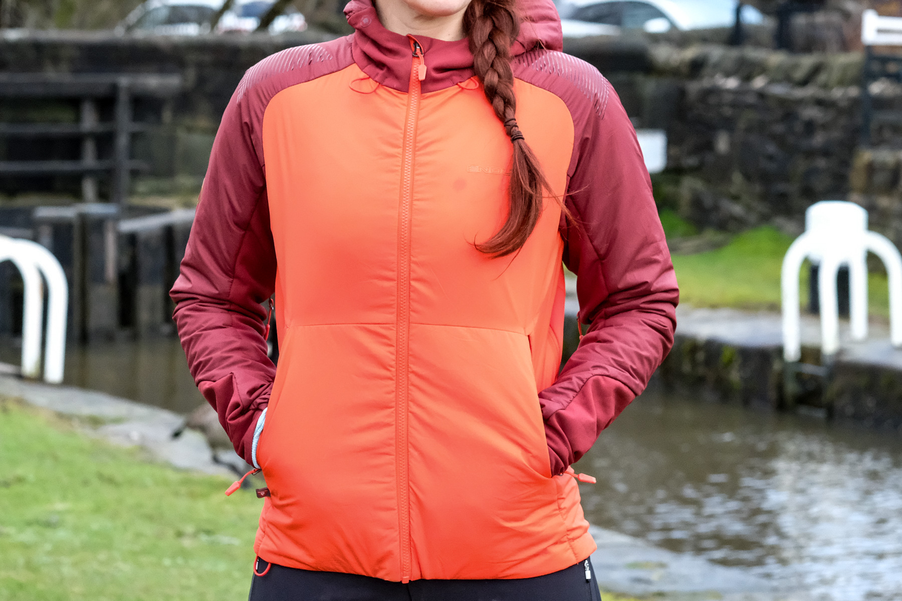 The front of the jacket and the majority of the arms are constructed from PrimaLoft insulated fabric with ripstop. The back and underarms are a stretch PrimaLoft without the insulation. The front zip has an inch wide band on the back to stop any air sneaking in, and the cuffs are a close fit thanks to some very strong elastic on a small section.
