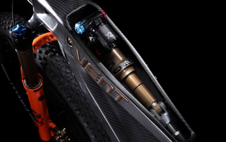Yep. Within the carbon top tube, just behind the stem, is a Fox Factory DPSX2, connected to the 4 bar (I think?) suspension layout through the frame. Keeps it out of the muck, and easy to adjust on the fly I suppose. There are actually 2 spec levels, the RR (Race Ready. Which race? Who knows.) above, which is 150mm Fox Factory 36, XX1 gears (NX shifter), the posh Braking brakes I wrote about a while back, and aluminium SunRingle Duroc wheels. Boost rear, non boost front, apparently.